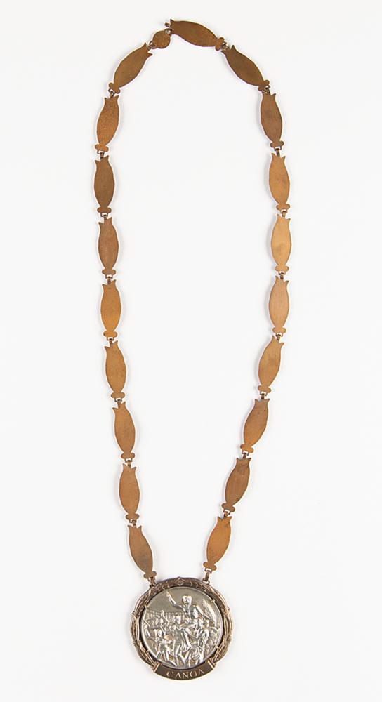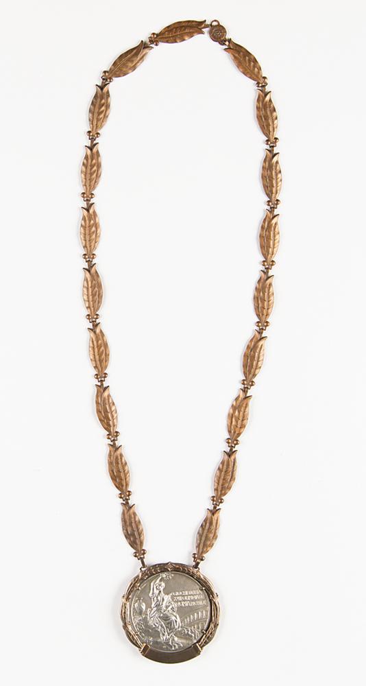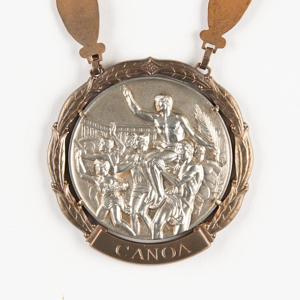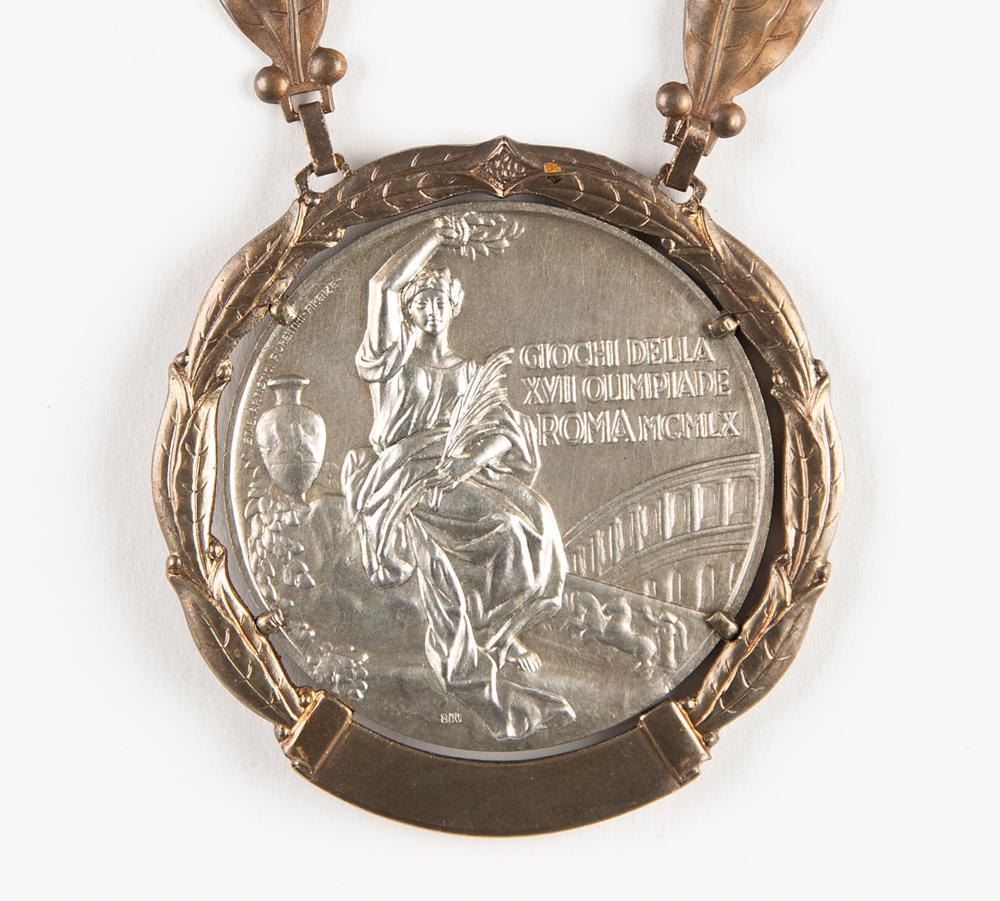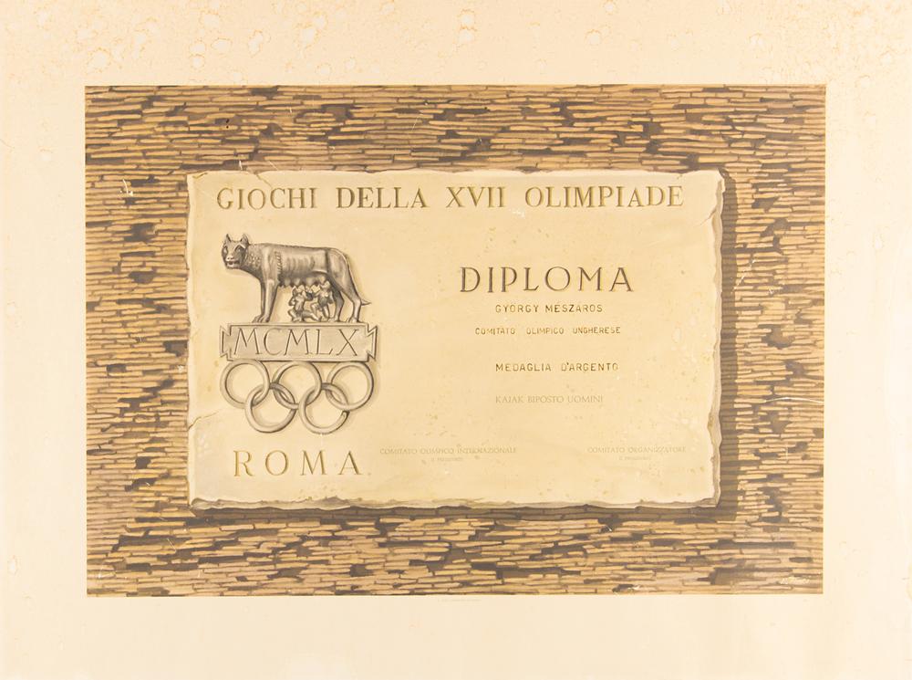 Beautiful winner's medal issued to Hungarian canoeist Gyorgy Meszaros at the Rome 1960 Summer Olympics. Silver, 68 mm, 102 gm, by Giuseppe Cassioli; manufactured by Artistice Fiorentini. The front depicts a victorious athlete being carried by several jubilant athletes; the reverse, inscribed, "Giochi Della XVII Olimpiade Roma MCMLX," features a 'Seated Victory' with the Colosseum in the background. The medal is set in its original cast bronze bezel, engraved at the bottom with the name of the sport in Italian, "Canoa,” and suspends from its beautiful bronze winner’s chain with 20 olive leaf links. Includes its official 24.5 x 18.5 second-place winner’s diploma issued to Meszaros, which bears scattered toning and dampstaining.