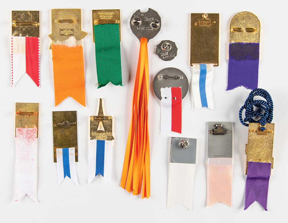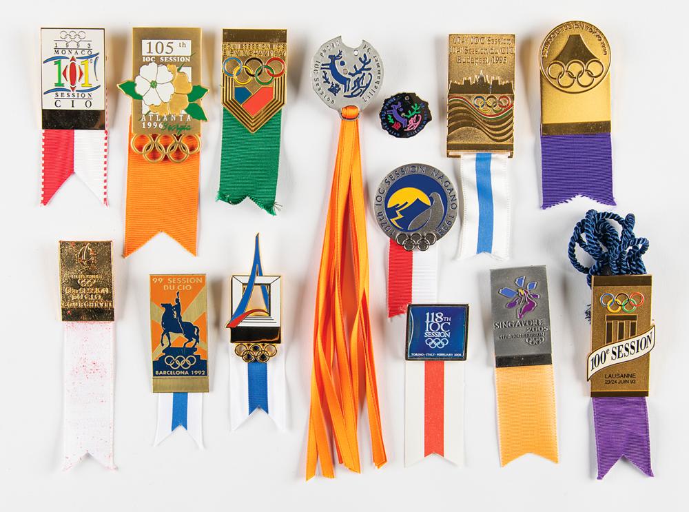 Group of thirteen badges for the 96th through 118th International Olympic Committee sessions (missing 106th and 108-116th sessions for a full run). Includes: