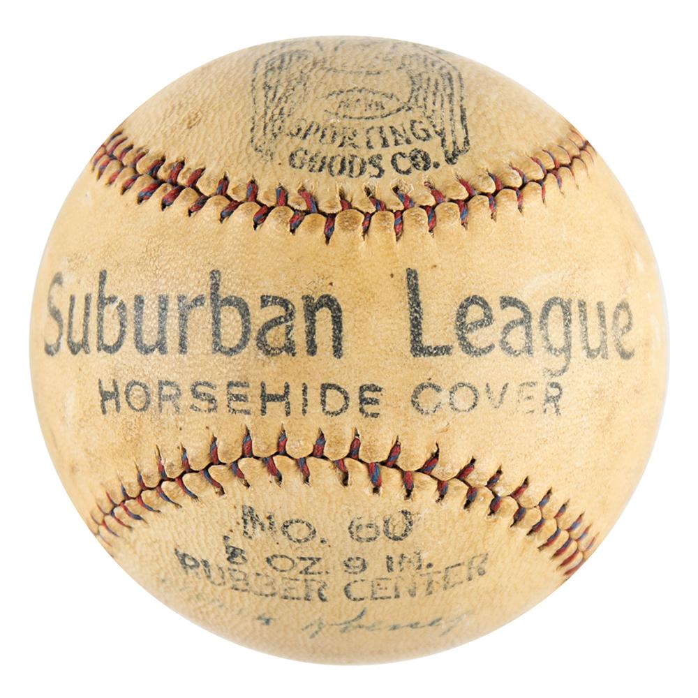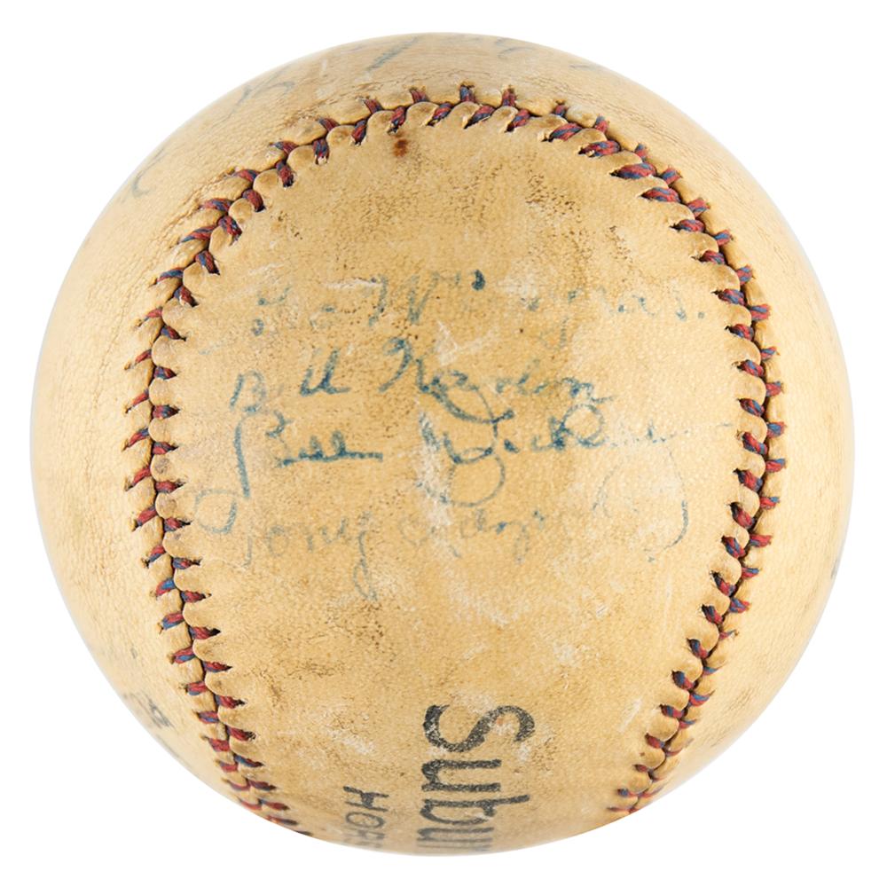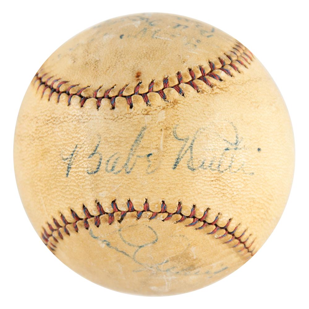Official Tober Suburban League baseball signed in fountain pen on the sweet spot and side panels by seven members of the 1930 New York Yankees squad, including: Babe Ruth (ss), Lou Gehrig, Bill Dickey, Tony Lazzeri, George Pipgras, Bill Karlon, and Mark Koenig. In very good to fine condition, with light soiling and toning, and fading to a few of the lesser names. A star-studded signed baseball, highlighted by the legendary Babe Ruth and Lou Gehrig.