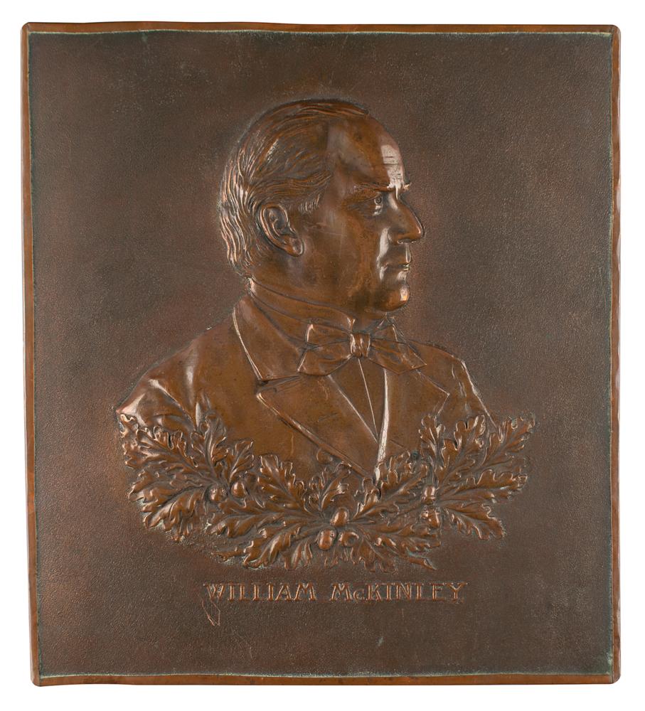 Bronze circa 1901 memorial wall plaque mourning the assassination of President William McKinley, 13.75 x 15.5, featuring a raised portrait of him in near profile. In fine condition, with slight denting to McKinley's image.
