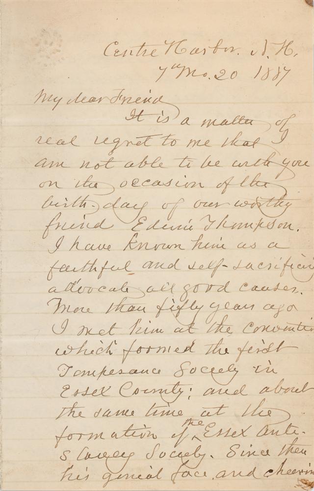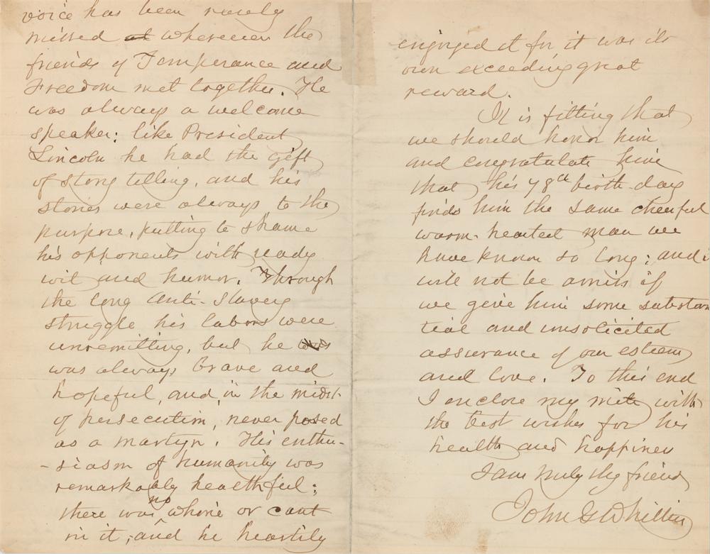ALS signed “John G. Whittier,” three pages on two adjoining sheets, 4.5 x 6.75, July 20, 1887. Handwritten letter to a friend, in part: "It is a matter of real regret to me that I am not able to be with you on the occasion of the birthday of our worthy friend, Edwin Thompson. I have known him as a faithful and self-sacrificing advocate of all good causes. More than fifty years ago I met him at the convention which formed the First Temperance Society in Essex County, and about the same time, at the formation of the Essex Anti-Slavery Society. Since then, his genial face and cheering voice has been rarely missed wherever the Friends of Temperance and Freedom meet together. He was always a welcome speaker: like President Lincoln he had the first of storytelling, and his stories were always to the purpose, putting to shame his opponents with ready wit and humor. Through the long Anti-Slavery struggle, his labors were unremitting, but he was always brave and hopeful and, in the midst of persecution, never posed as a martyr…It is fitting that we should honor him and congratulate him that his 78th birthday finds him the same cheerful, warm-hearted man we have known so long." In fine condition, with a small piece of old tape to the top of the inner hinge.