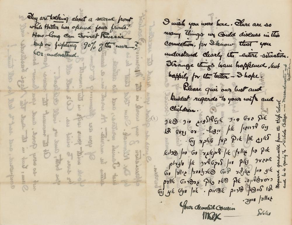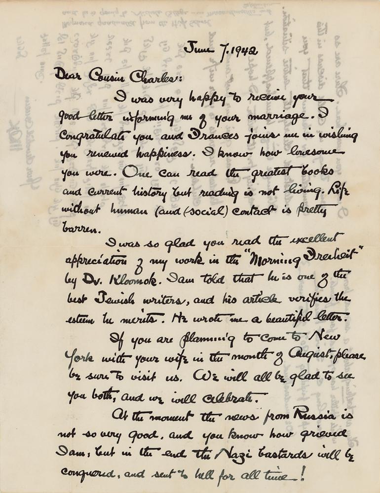 Jewish-American painter (1881-1961) celebrated for his Cubist works on Jewish themes. ALS signed “Max,” one page both sides, 8.5 x 11, June 7, 1942. Handwritten letter to his cousin, Charles Getz, congratulating him on his marriage and writing in support of Russia against the Nazis during World War II. In part: "I was very happy to receive your letter informing me of your marriage?I know how lonesome you were. One can read the greatest books and current history but reading it not living. Life without human (and social) contact is pretty barren. I was so glad you read the excellent appreciation of my work in the 'Morning Freiheit' by Dr. Kloomok. I am told that he is one of the best Jewish writers, and his article verifies the esteem he merits?At the moment the news from Russia is not so very good, and you know how grieved I am, but in the end the Nazi bastards will be conquered, and sent to hell for all time!?They are talking about a second front while Hitler has opened four fronts! How long can Soviet Russia keep on fighting 90% of the war?" He writes the last paragraph in Yiddish (translated): "I would like to apologize for not writing in Yiddish, it takes too long, and I admit I don't know it well enough. I was in Chicago but after my lecture in the museum my whole time was taken up by receptions. I was more than glad to run back home, even one single minute was not mine." In fine condition.