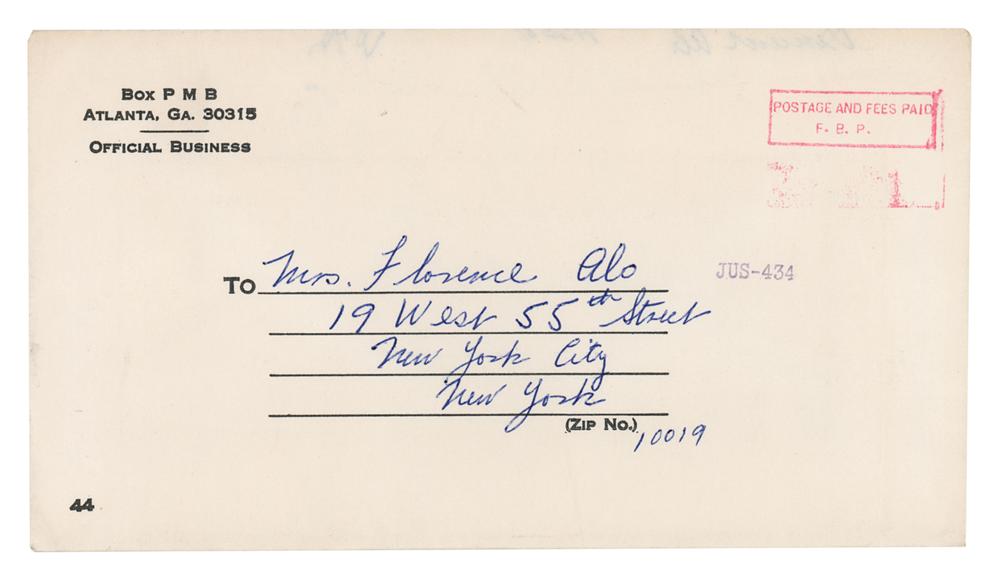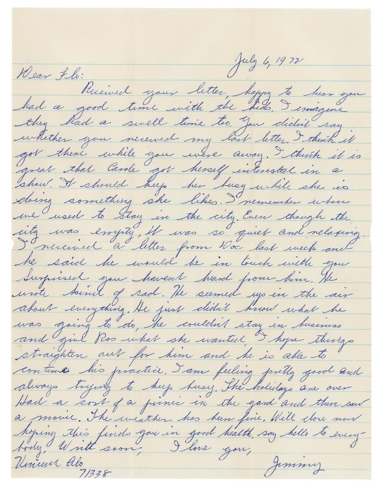 New York mobster (1904-2001) who was a high-ranking capo in the Genovese crime family, known for establishing casino operations with mob associate Meyer Lansky. ALS signed “Jimmy,” one page, 8 x 10.5, July 6, 1972. Handwritten letter to his wife, Florence Alo, written from prison. In part: "Happy to hear you had a good time with the kids. I imagine they had a swell time too. You didn't say whether you received my last letter. I think it got there while you were away. I think it is great that Carole got herself interested in a show. It should keep her busy while she is doing something she likes. I remember when we used to stay in the city. Even though the city was empty, it was so quiet and relaxing. I received a letter from Doc last week and he said he would be in touch with you. Surprised you haven't heard from him. He wrote kind of sad. He seemed up in the air about everything. He just didn't know what he was going to do, he couldn't stay in business and his give Ros what she wanted. I hope things straighten out for him and he is able to continue his practice. I am feeling pretty good and always trying to keep busy. The holidays are over. Had a sort of picnic in the yard and then saw a movie." In fine condition. Accompanied by the original mailing envelope, addressed in Alo's own hand.