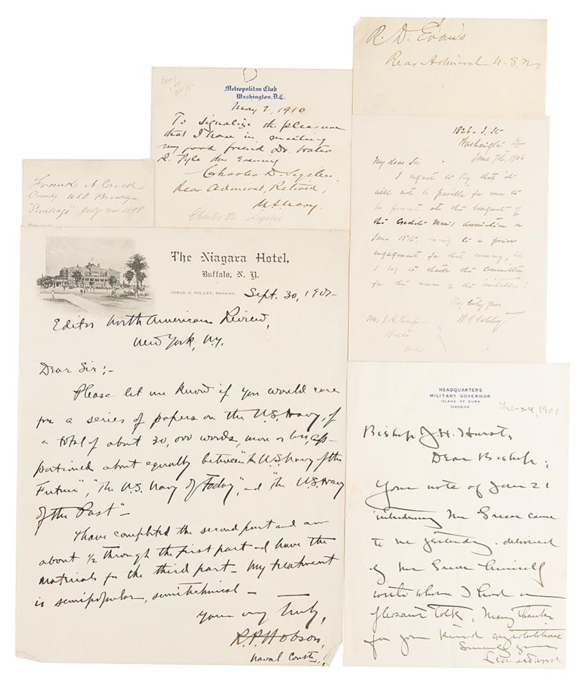 Six autographs from heroes of the Spanish-American War, including several participants in the decisive Battle of Santiago de Cuba. Includes: Robley D. Evans (signature), who commanded the USS Iowa in the Battle of Santiago; Francis A. Cook (signature), commander of the USS Brooklyn in the Battle of Santiago; Charles D. Sigsbee (signature), commander of the USS Maine; Winfield Scott Schley (ALS), the hero of the Battle of Santiago; Leonard Wood (ALS), who commanded the Rough Riders; and Richmond P. Hobson (ALS), who became a prisoner of war after the USS Merrimac was sunk during the Battle of Santiago. In overall very good to fine condition.