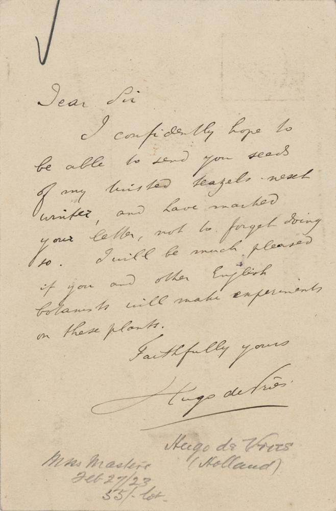 Hugo de Vries: The pioneering Dutch geneticist sends his seeds: "I will be much pleased if you and other English botanists will make experiments on these plants"
