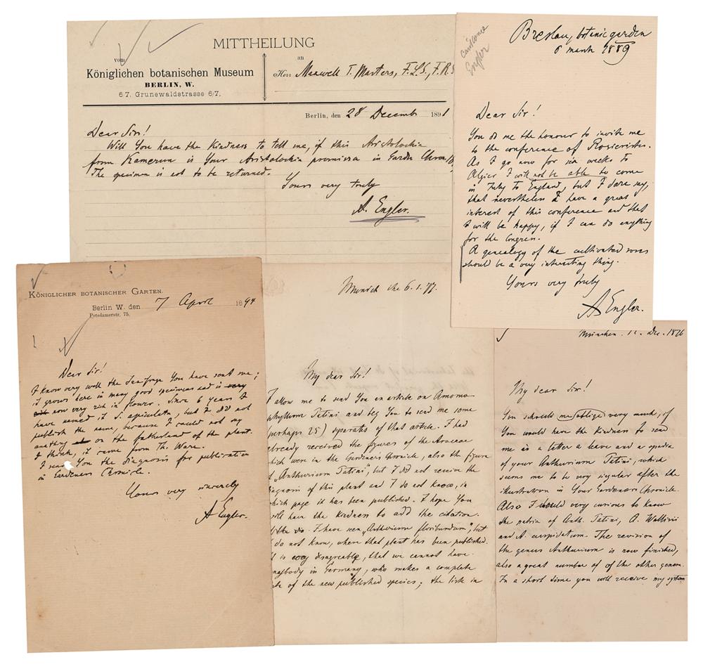 German botanist (1844-1930) known for his prodigious work on plant taxonomy and phytogeography; his system of plant classification, the 'Engler system,' is still used by many herbaria and is followed by writers of many manuals. Five ALSs, all signed "A. Engler" or "Dr. A. Engler," totaling seven pages, dated from 1876 to 1894. All to English botanist and taxonomist Maxwell T. Masters, with good botanical content throughout. Engler thanks Masters for sending botanical journal articles (mentioning several pieces on Anthurium varieties), asks for identification of an "Aristolochia promissa" specimen, declines an invitation to a conference, and comments on a specimen sent him: "It grows here in many good specimens and is now very rich in flower." In overall fine condition.