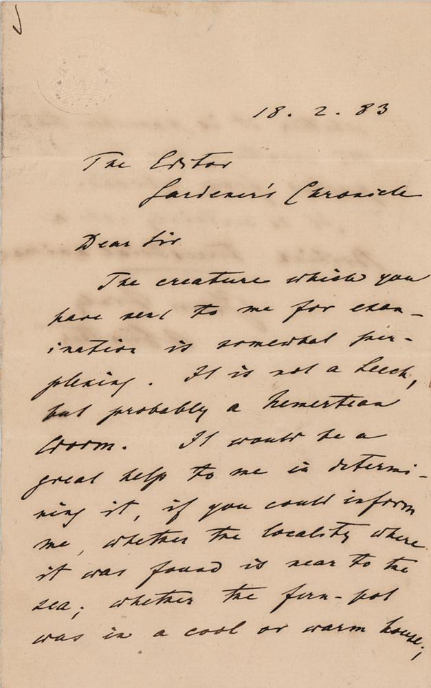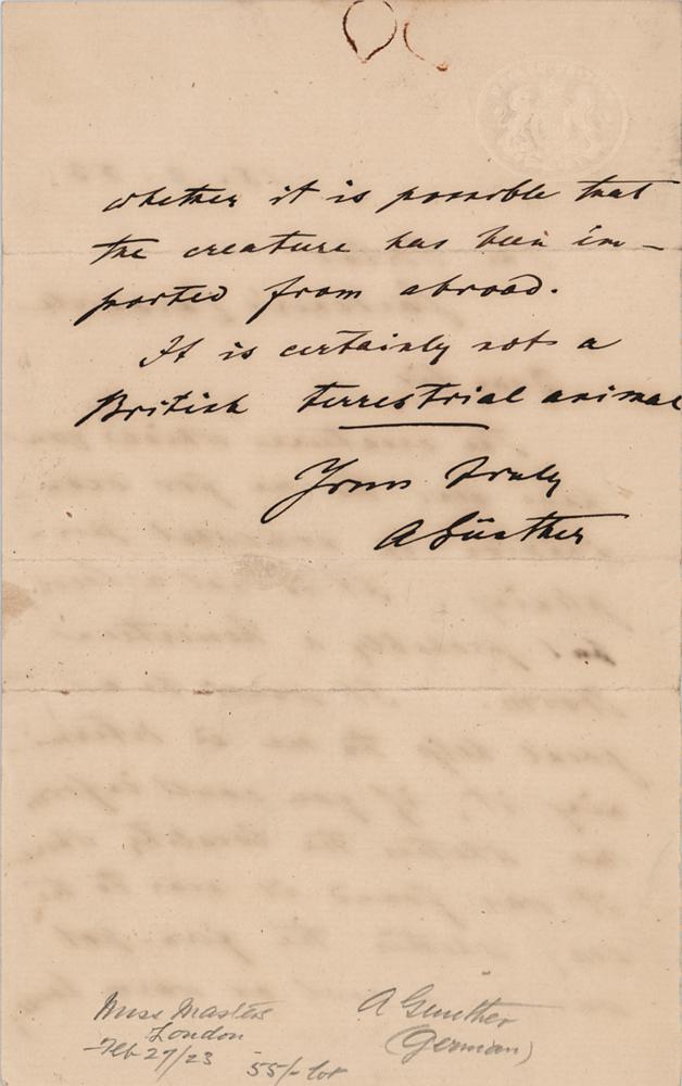 German-born British zoologist, ichthyologist, and herpetologist (1830-1914) regarded as one of the most productive reptile taxonomists, with more than 340 reptile species described. ALS signed “A. Gunther,” one page both sides, 4.5 x 7, February 18, 1883. Handwritten letter to English botanist and taxonomist Maxwell T. Masters, as "The Editor, Gardener's Chronicle." In full: "The creature which you have sent to me for examination is somewhat perplexing. It is not a leech, but probably a Nemertean worm. It would be a great help to me in determining it, if you could inform me, whether the locality where it was found is near to the sea; whether the fern-pot was in a cool or warm house; whether it is possible that the creature has been imported from abroad. It is certainly not a British terrestrial animal." In fine condition.