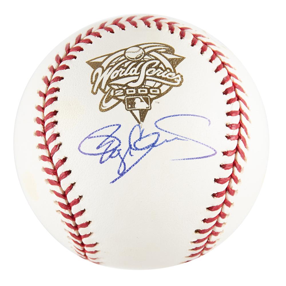 Official Rawlings 2000 World Series baseball, signed in blue ballpoint on the side panel below the World Series logo by Roger Clemens. In overall fine condition, with a PSA/DNA label affixed to the rear (certificate of authenticity not present).