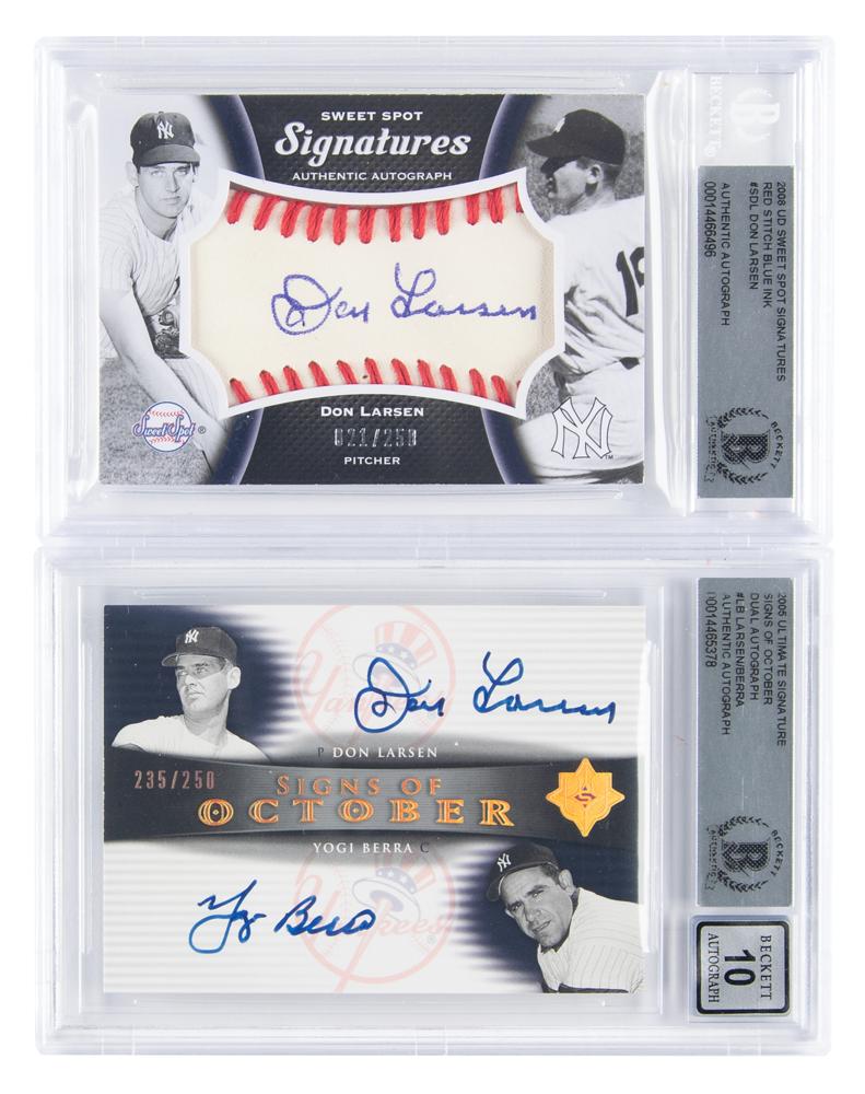 Two signed baseball cards: a 2005 Ultimate Signature Signs of October Dual Autograph of Don Larsen and Yogi Berra, numbered 235/250, encapsulated by Beckett with an autograph grade of "10"; and a 2008 Upper Deck Sweet Spot Signatures autograph of Don Larsen, numbered 21/250, encapsulated by Beckett as authentic. In overall fine condition.