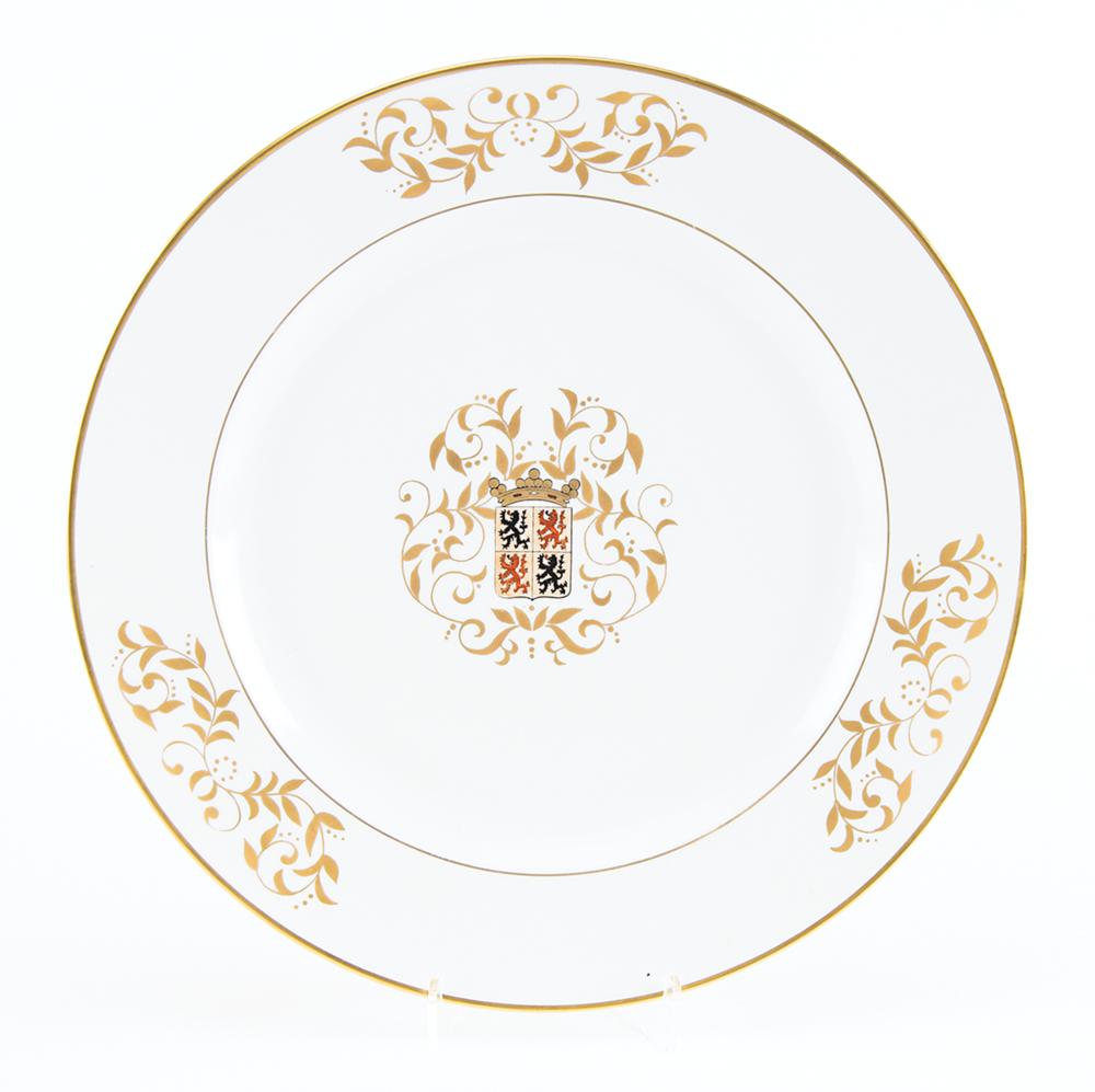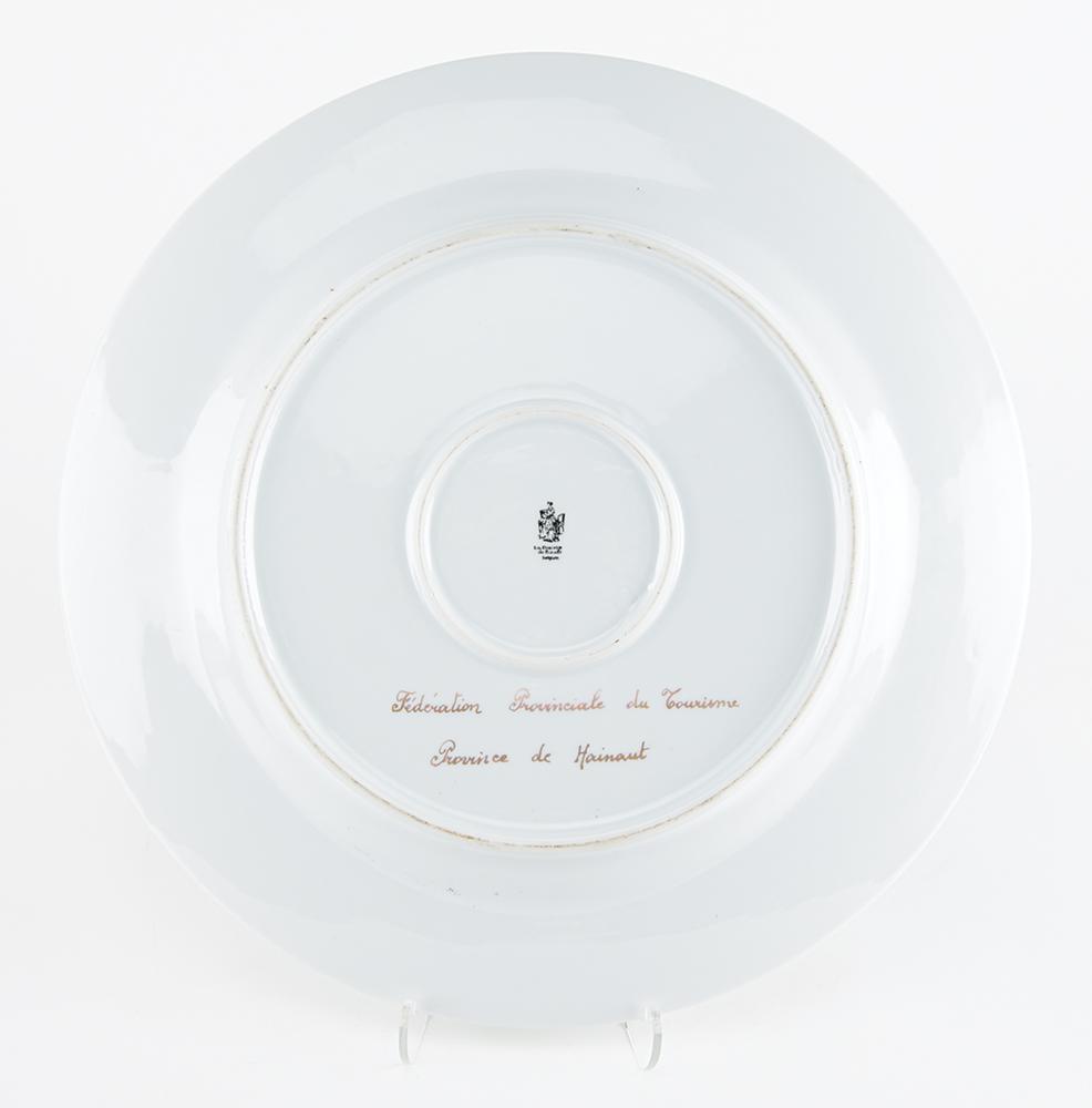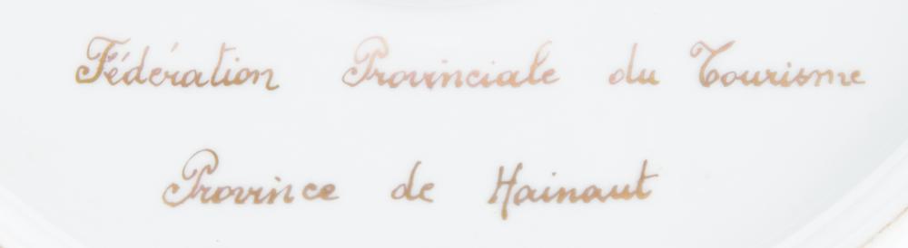 Large 13″ diameter porcelain plate made as a diplomatic presentation to U.S. Ambassador to the Kingdom of Belgium, Charles H. Price II, circa 1981-83. The November 15, 2013, letter of authentication accompanying the porcelain platter, on the letterhead of Carol Rice, states: “This letter serves as confirmation that the 13 inch in diameter plate bearing royal arms [of the Belgian Province of Hainaut] was a gift to Ambassador Price while serving in Belgium [and] came from the estate of Charles H. Prince II.” Inscription: “Fédération Provinciale du Tourisme Province of Hainaut.” Manufacturer: La Porcelaine De Baudour Belgium, with manufacturer’s mark.