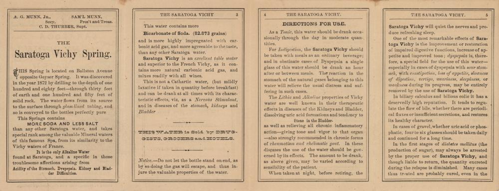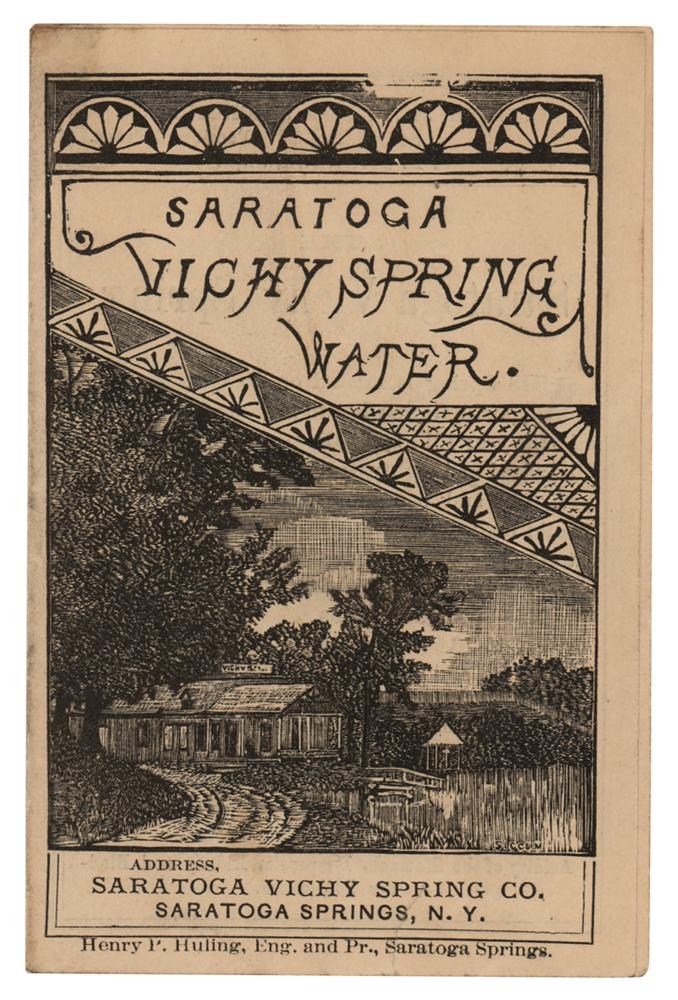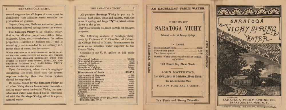 Eight-page brochure of the Saratoga Vichy Springs Co., Saratoga Springs, NY. Henry P. Hulling, Engraver and Printer, Saratoga Springs. Circa 1912. Detailed description of the Saratoga Vichy Spring, with engraving of the Spring on page one. “This Spring is located on Ballston Avenue opposite Geyser Spring. It was discovered in the year 1872 by drilling to the depth of one hundred and fifty feet of solid rock.” “Saratoga Vichy will quiet the nerves and produce refreshing sleep.” “An Excellent Table Water.” List of prices. Company’s office located at 122 Pearl St. New York. In fine condition.