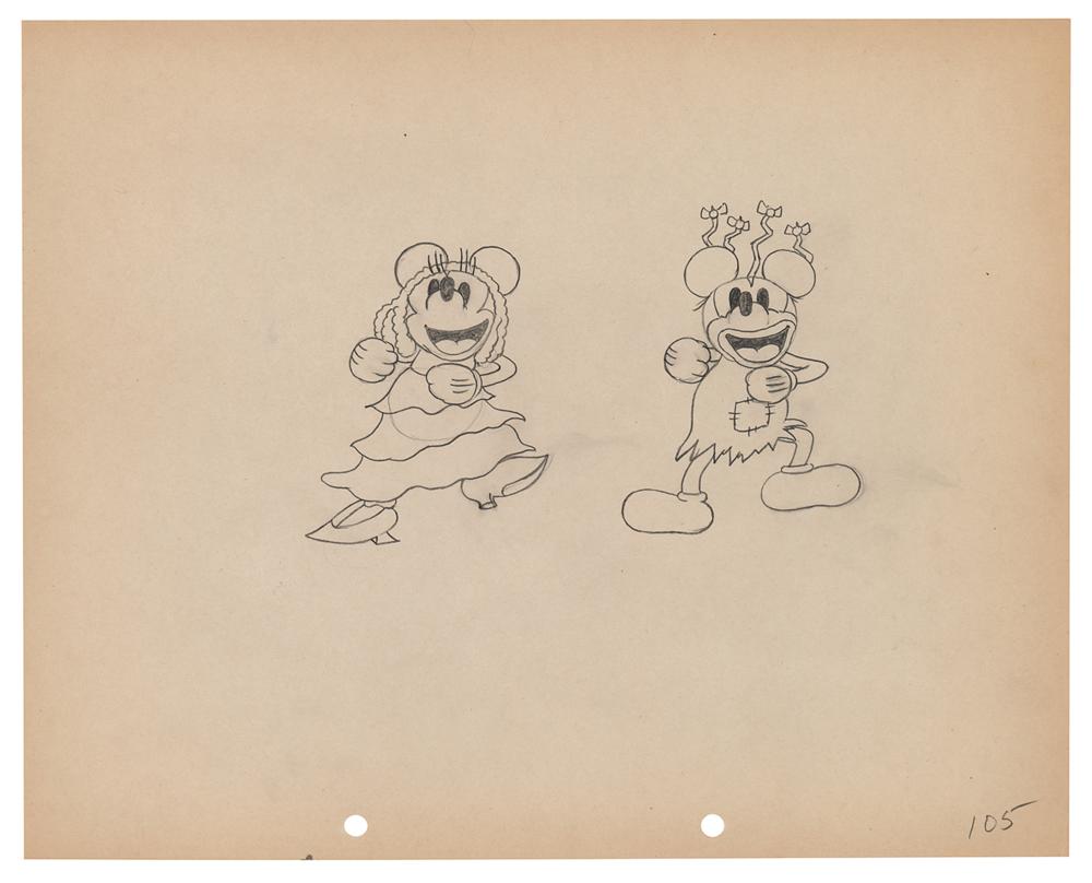 (Walt Disney Studios, 1933) Original production drawing of Mickey and Minnie Mouse from Mickey's Mellerdrammer, showing the pair dancing in costume during their production of Uncle Tom's Cabin. Accomplished in graphite on slightly trimmed 11.75 x 9.5 animation paper, which is marked in the lower right, "105." Total character image measures 6.25 x 4. In fine condition. Mickey's Mellerdrammer is today considered controversial as it is essentially a take-off on a minstrel show, and Mickey—as seen here—is dressed in blackface.