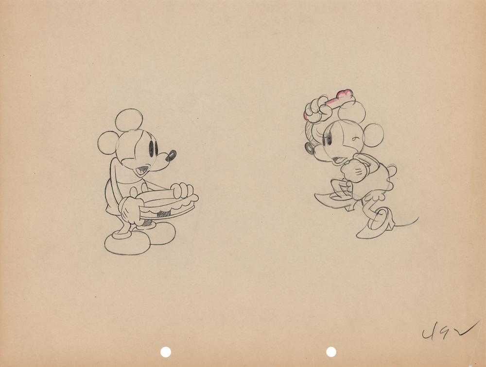 (Walt Disney Studios, 1933) Original production drawing of Mickey and Minnie Mouse from Puppy Love, which shows the quarreling mice in full-figure poses, with Mickey holding an empty heart-shaped box and Minnie holding a dog bone above her head. Accomplished in graphite and colored pencil on slightly trimmed 11.75 x 9.5 animation paper, marked "492" in the lower right corner. Both images approximately measure 2.5 x 3.5. In fine condition, with a crease to the lower right corner.