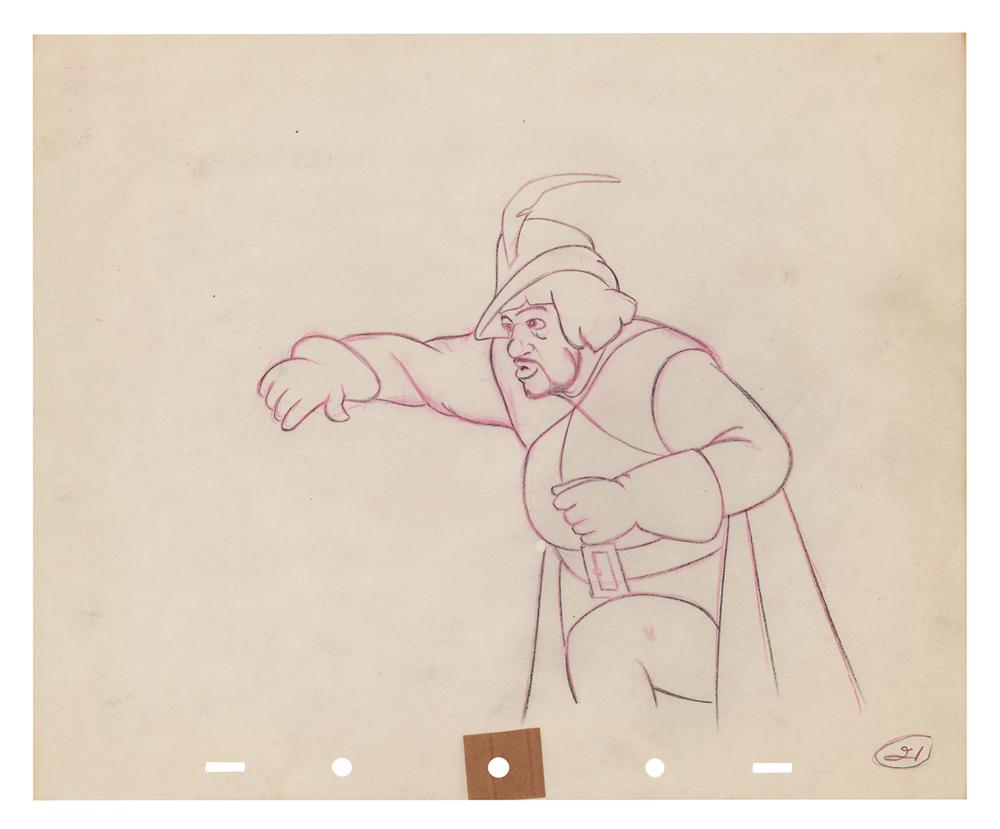 (Walt Disney Studios, 1937) Scarce original production drawing of The Huntsman from Snow White and the Seven Dwarfs, depicting the hunter in a kneeling pose measuring 8 x 7. Accomplished in graphite and colored pencil on untrimmed 12 x 10 animation paper marked "21" in the lower right corner. In fine condition, with a short chip along the top edge. The Huntsman remains a decidedly uncommon Disney character, as he appears only briefly in Snow White.