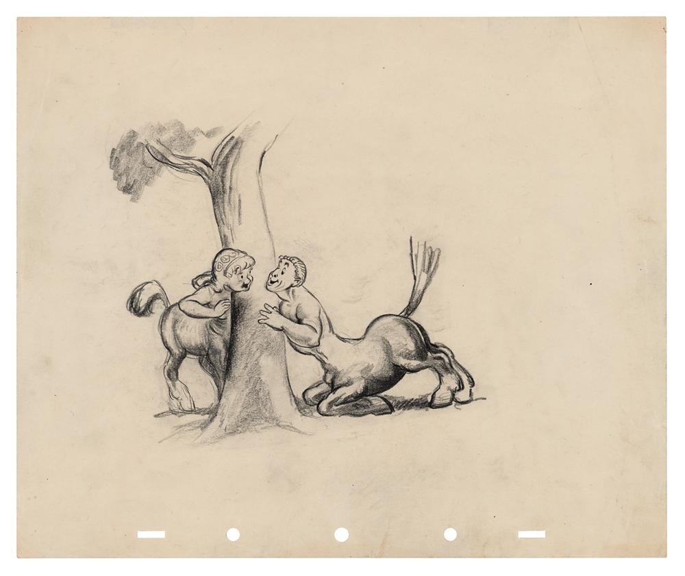 (Walt Disney Studios, 1940) Appealing original concept storyboard drawing of male and female Centaurs from Fantasia, which shows the two Centaurs flirting with each other around a tree trunk from the 'Pastoral Symphony' sequence. Accomplished in graphite on untrimmed 12 x 10 animation paper. Total character image measures 7 x 5.75. In fine condition, with a few pin holes.