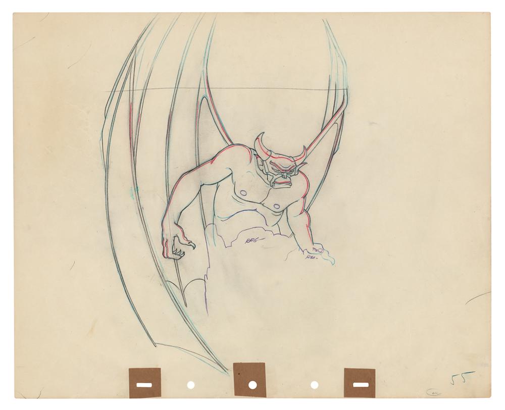 (Walt Disney Studios, 1940) Original production drawing of the Chernabog from Fantasia, showing the imposing winged demon during the terrifying 'Night on Bald Mountain' sequence. Accomplished in graphite and colored pencil on untrimmed 15.5 x 12.5 animation paper, marked "55" in the lower corner. Image measures 8.5 x 11.25. In fine condition, with a few light creases. A ferociously large drawing of Vladimir Tytla's greatest creation.