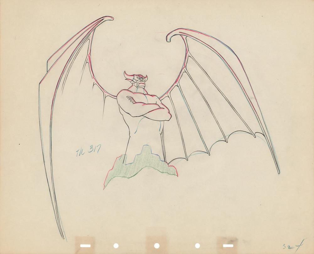 (Walt Disney Studios, 1940) Original production drawing of the mighty Chernabog from Fantasia, depicting the imposing demon with arms folded and wings spread wide during the terrifying 'Night on Bald Mountain' sequence. Accomplished in graphite and colored pencil on untrimmed 15.5 x 12.5 animation paper marked "324" in the lower right corner. Image measures 11.25 x 11. In fine condition, with trivial toning to lower border and a small tear to top edge. A powerful drawing of Vladimir Tytla's greatest and most evil creation.