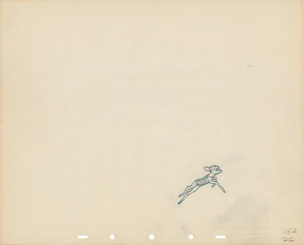 (Walt Disney Studios, 1942) Desirable original production drawing featuring Bambi from Bambi, showing the beloved fawn in a diminutive full-bodied pose. Accomplished in graphite and colored pencil on untrimmed 15.5 x 12.5 animation paper marked "152, 26" in the lower right corner. Image measures 2.5 x 2. In fine condition. A sought-after example, as Bambi drawings are rare.