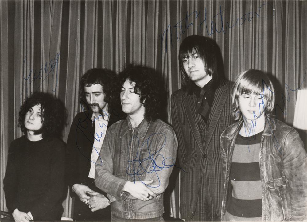 Vintage circa 1968-1971 glossy 7 x 5 photo of Fleetwood Mac, signed in blue ballpoint by Mick Fleetwood, John McVie, Peter Green, Jeremy [Spencer], Danny Kirwan. In fine condition, with poor-to-moderate signature contrast.