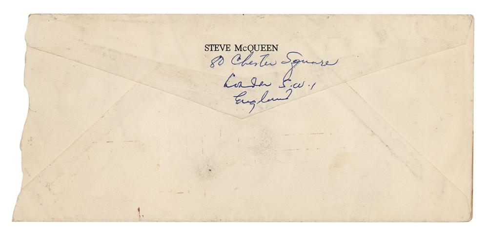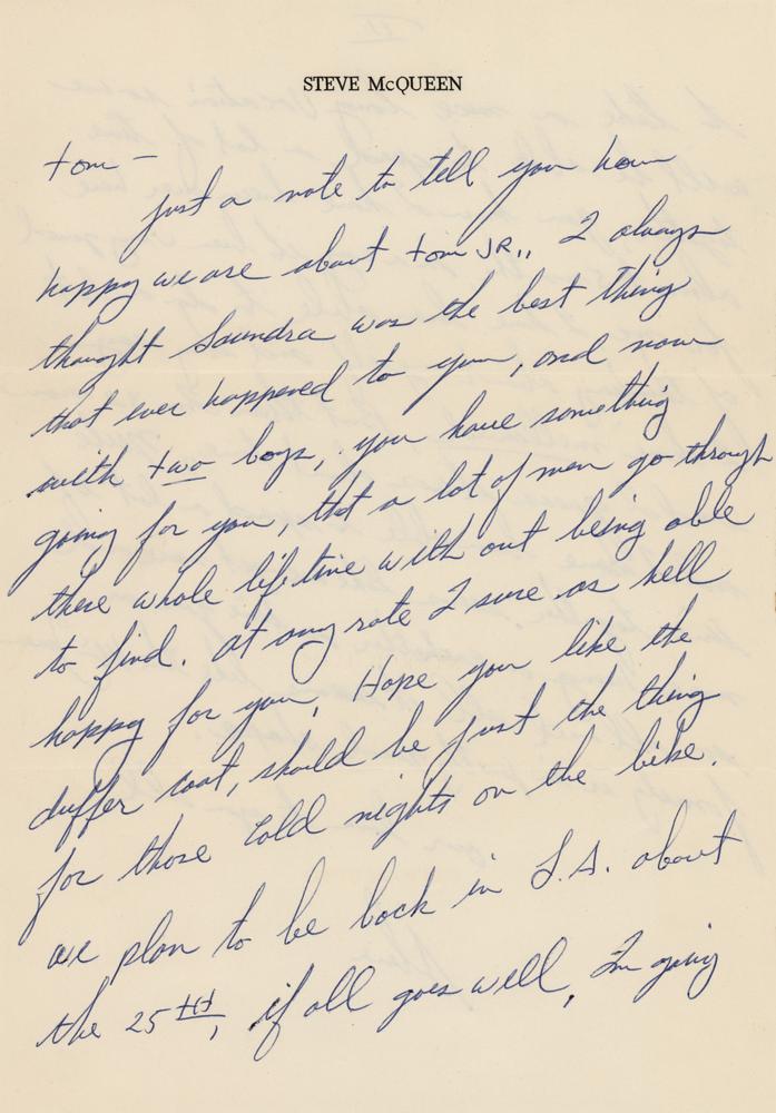 ALS signed “Steve,” one page both sides, 7 x 10, personal letterhead, January 6, 1962. Handwritten letter to Tom Gilson in Van Nuys, California, in full: "Just a note to tell you how happy we are about Tom Jr., I always thought Sandra was the best thing that ever happened to you, and now with two boys, you have something going for you, that a lot of men go through their whole lifetime without being able to find. At any rate I sure as hell happy for you. Hope you like the duffer coat, should be just the thing for those cold nights on the bike. We plan to be back in L.A. about the 25th. if all goes well, I'm going to take a nice long vacation so we will be able to spend a lot of time together, you know I have been over here almost 5 months, in a way it's been very good for me, I have been able to do a lot of thinking about myself, and they say I have mellowed. But then I'm 32 now and I guess it's about time. Neile and I have been able to spend a lot of time together, seems like we get more and more hung on each other as time goes on, so all and all it seems like the McQueen family is in pretty good shape." In fine condition. Accompanied by the original mailing envelope, addressed in McQueen's own hand.