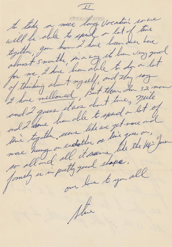 "Seems like the McQueen family is in pretty good shape"—mellowed and ready for a vacation, McQueen writes to a Van Nuys pal