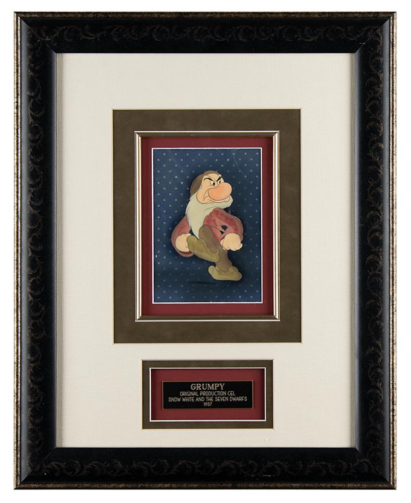 (Walt Disney Studios, 1937) Original production cel of Grumpy from Snow White and the Seven Dwarfs, showing the perpetually peeved dwarf in a full-length walking pose. The cel has been applied to an airbrushed background as prepared by Courvoisier Galleries for sale. Image measures 3.25 x 5, with a mat opening of 4.75 x 6.75. Triple-matted and framed to an overall size of 16.75 x 20.75. In very good to fine condition, with some light discoloration to cel paint, and rippling and a thin tear to upper background.