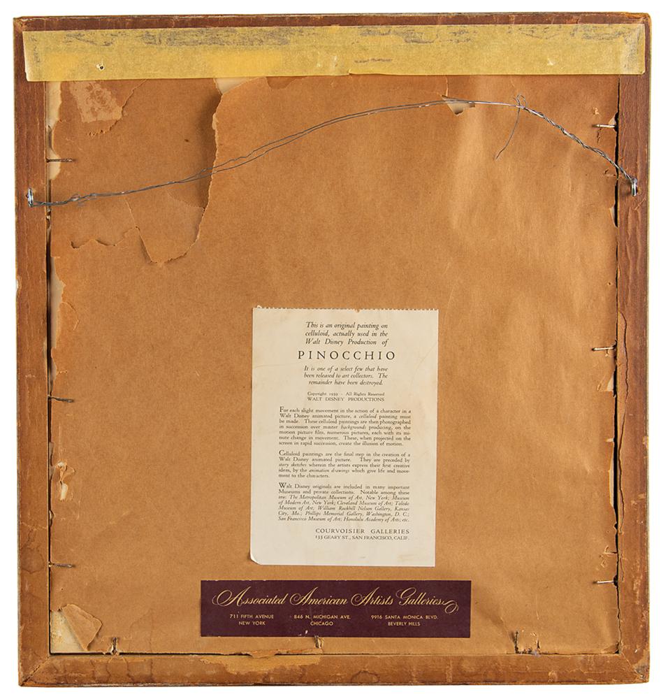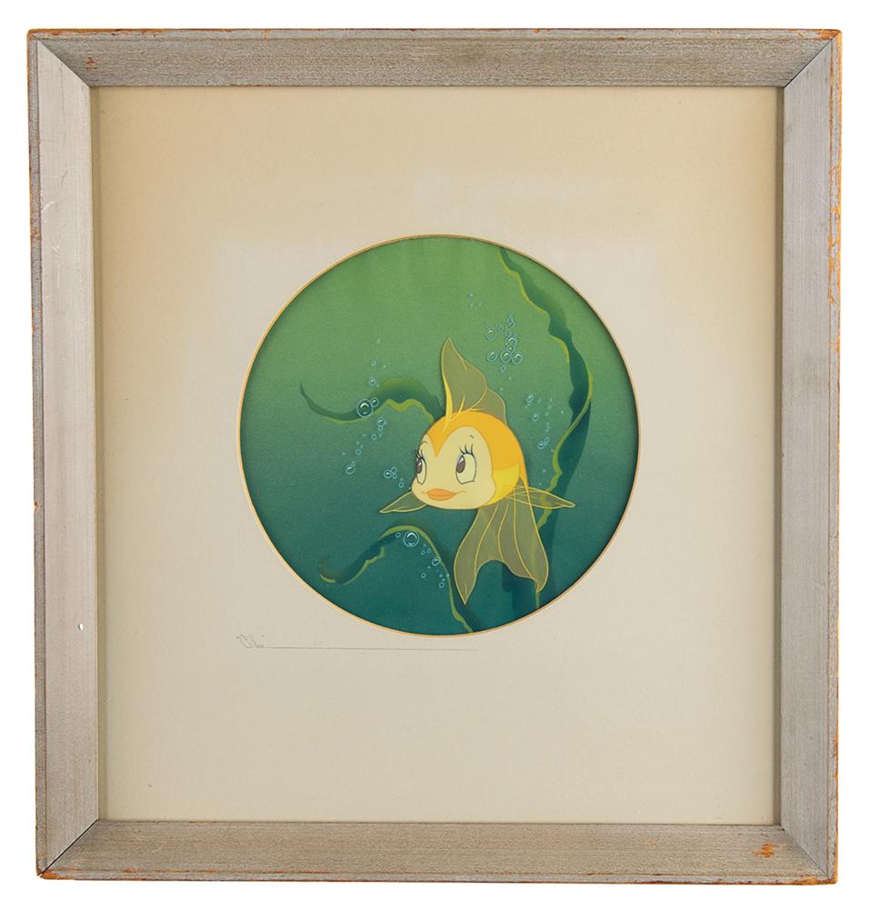 (Walt Disney Studios, 1940) Original production cel featuring Cleo from Pinocchio, showing Geppetto's pet goldfish with bubble special effects. The cel has been trimmed and applied to a hand-painted background as prepared by Courvoisier Galleries for sale. Image measures 3.25 x 4.25, with a mat opening of 6.5″ in diameter. Matted and framed to an overall size of 13 x 13.75; frame backing bears the original Walt Disney Productions label. In fine condition.