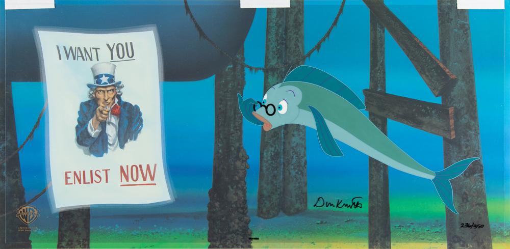 (Warner Brothers Studios, 1997) Limited edition cel for the live-action/animated comedy film The Incredible Mr. Limpet, numbered 236/350, signed in black felt tip by actor Don Knotts, who played both Mr. Limpet as well as the voice of the fish Limpet. The cel, which shows Limpet in fish form inspecting an Uncle Sam recruitment poster, is placed on an attractive matching giclee background. Image measures 11 x 7, with overall dimensions of 22.5 x 11. In fine condition. Accompanied by a certificate of authenticity from Warner Bros. A very displayable set-up of a memorable scene from the movie.