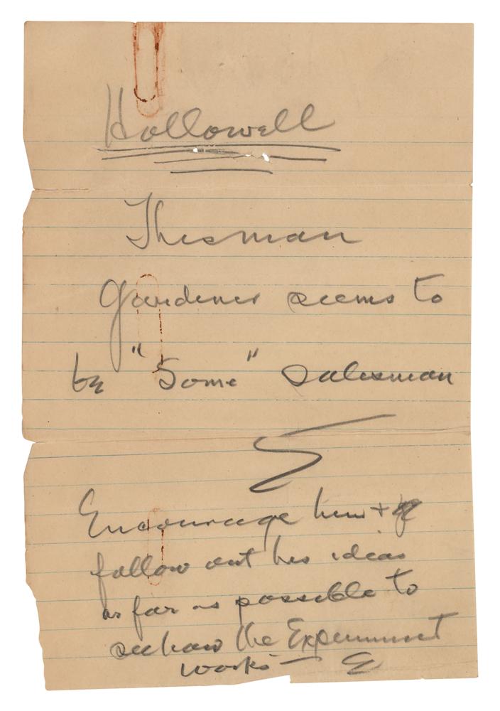ANS in pencil, signed twice with his initial, “E,” one page, 6 x 8.75, no date. Handwritten note in pencil, addressed to "Hallowell," in full: "This man Gardener seems to be 'some' salesman." Below, he adds: "Encourage him to follow out his ideas as far as possible to see how the experiment works." In very good to fine condition, with rough edges, a rusty paperclip impression to the top edge, and a tear within the underlining beneath "Hallowell" at the top. An interesting handwritten note from the celebrated inventor, widely known for both his laboratory experiments and his shrewd business acumen; this fine autograph combines the two.