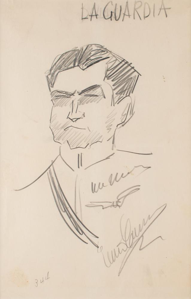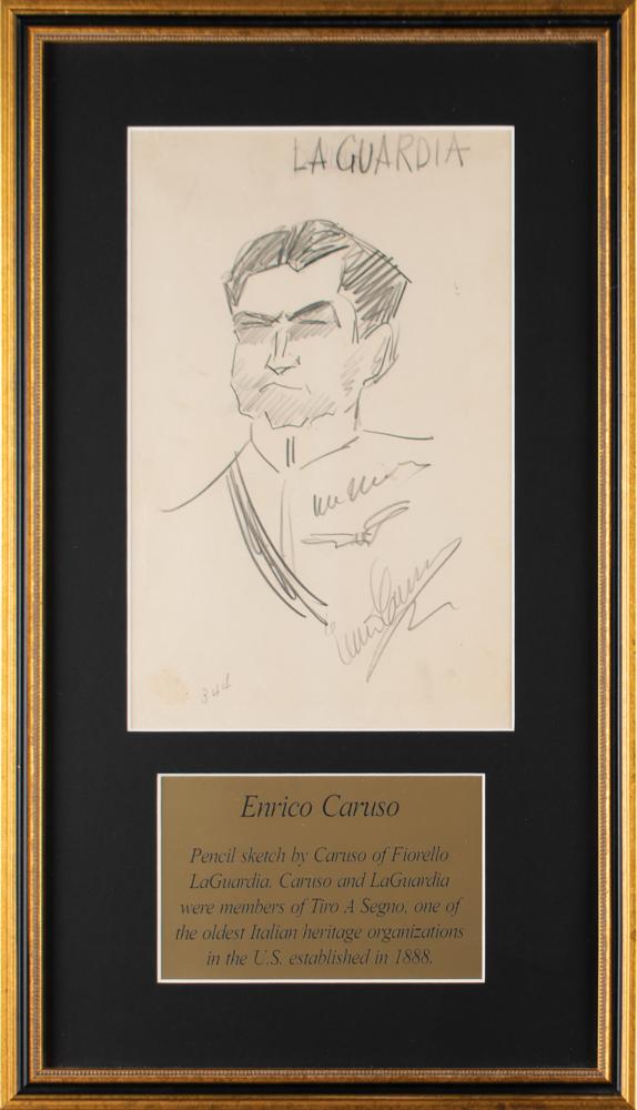 Original pencil sketch of New York politician Fiorello La Guardia accomplished by Caruso on an off-white 8 x 12.5 sheet, signed in the lower right corner in pencil, "Enrico Caruso." Nicely matted and framed with a biographical plaque to an overall size of 13.25 x 23. In very good to fine condition, with light creasing, and two small edge tears. Caruso and La Guardia were members of Tiro A Segno, a private club established in 1888 and one of the oldest Italian heritage organizations in the United States.