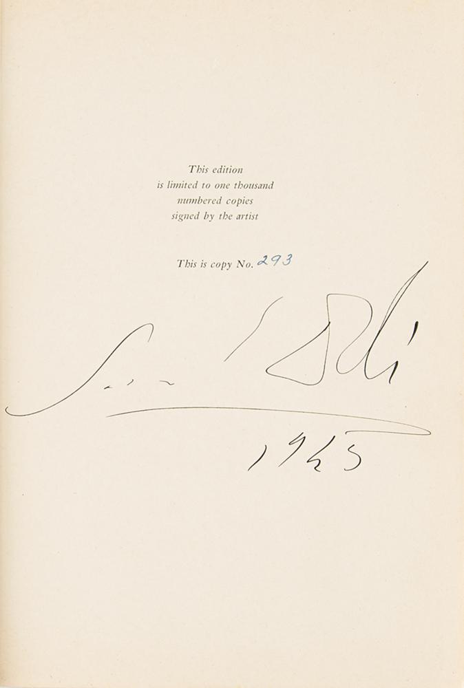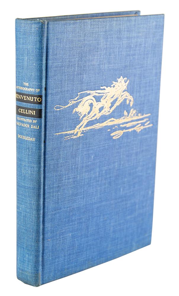 Signed book: The Autobiography of Benvenuto Cellini, Illustrated by Salvador Dali. Limited first edition, 293/1000. NY: Doubleday, 1946. Blue cloth hardcover, 7 x 9.75, 442 pages. Signed on the colophon in fountain pen, "Salvador Dali, 1945." Autographic condition: fine. Book condition: VG/None, with minor splitting to paper at front hinge.