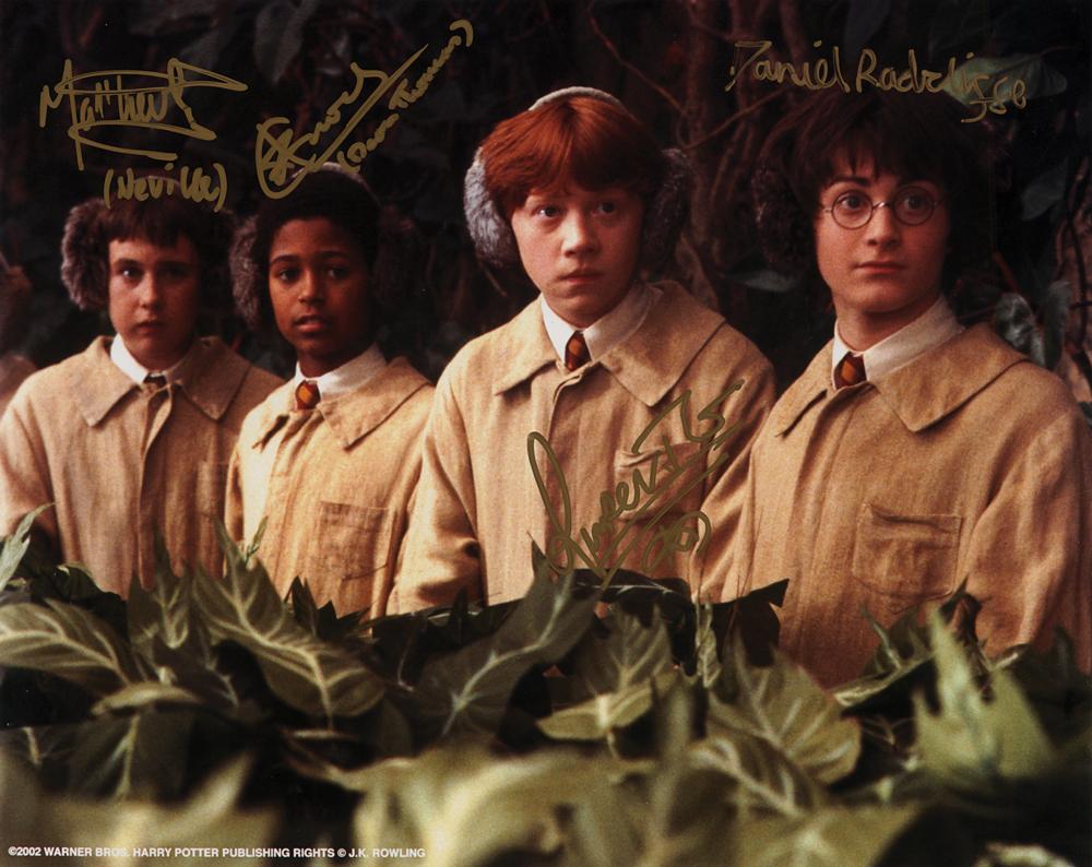 Color glossy 10 x 8 Warner Bros. publicity photo of four actors from the Harry Potter film series, signed in gold ink by Daniel Radcliffe, Rupert Grint, Alfred Enoch, and Matthew Lewis, the last two adding their character names. In fine condition.
