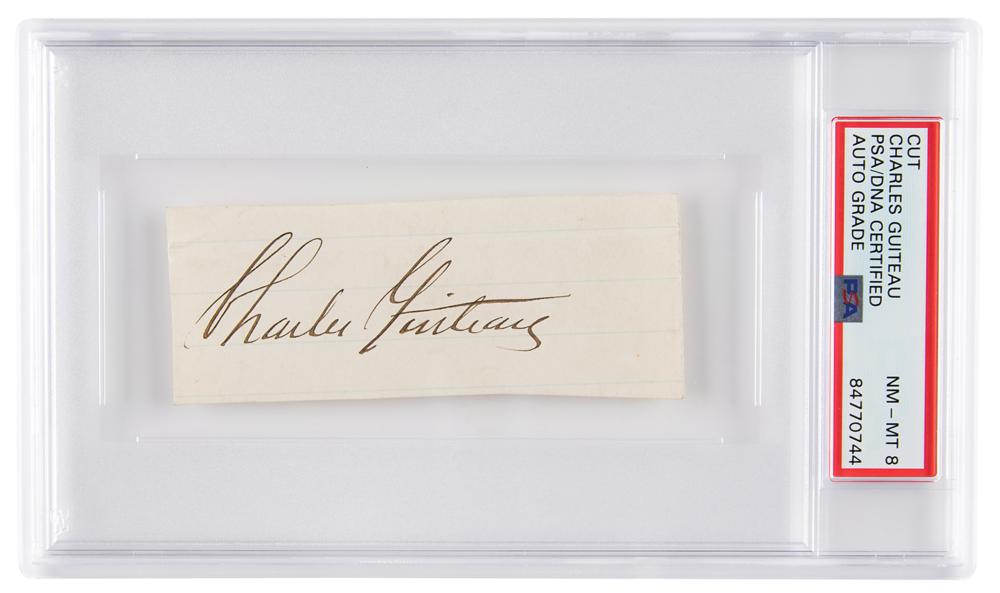 American lawyer (1841-1882) who, frustrated in his attempt to secure an ambassadorship, assassinated President James Garfield in 1881. Crisp ink signature, "Charles Guiteau,” on an off-white 3.75 x 1.5 slip. In fine condition. Encapsulated and graded by PSA/DNA as "NM-MT 8."