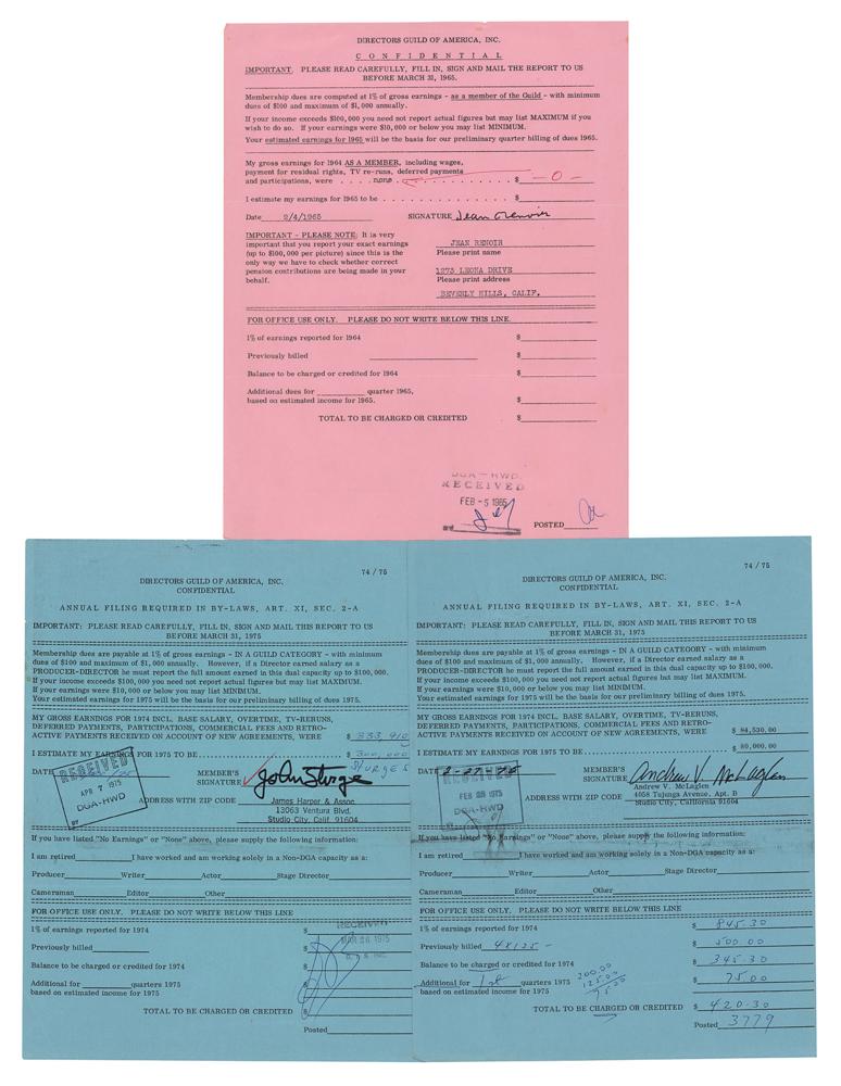 Three DSs, each one page, 8.5 x 11, dated 1965 and 1975, individually signed by notable film directors Jean Renoir, John Sturges, and Andrew V. McLaglen. Each document relates to membership dues for the Directors Guild of America, with each director signing to the right side in black ink. In overall fine condition.