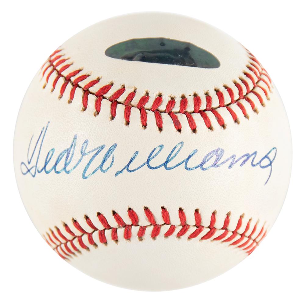 Official Rawlings American League (Brown) baseball signed in black ballpoint on the sweet spot by Ted Williams. In fine condition, with some faint toning and a Ted Williams '9' authenticity sticker affixed to the upper panel.