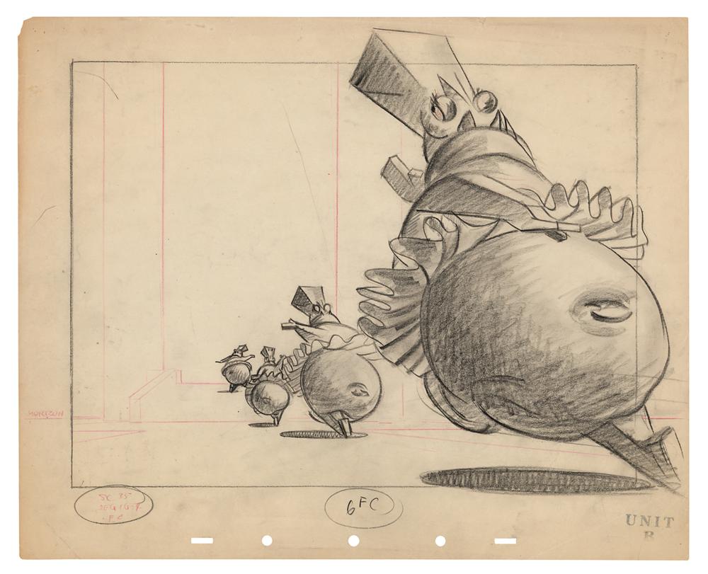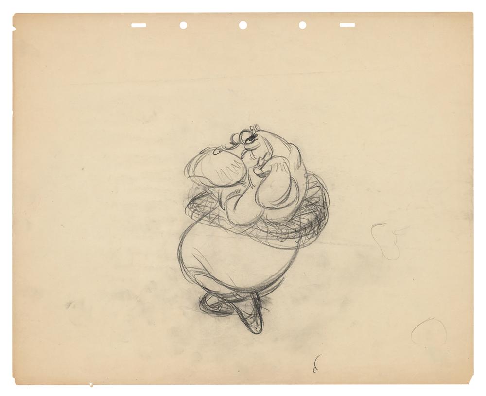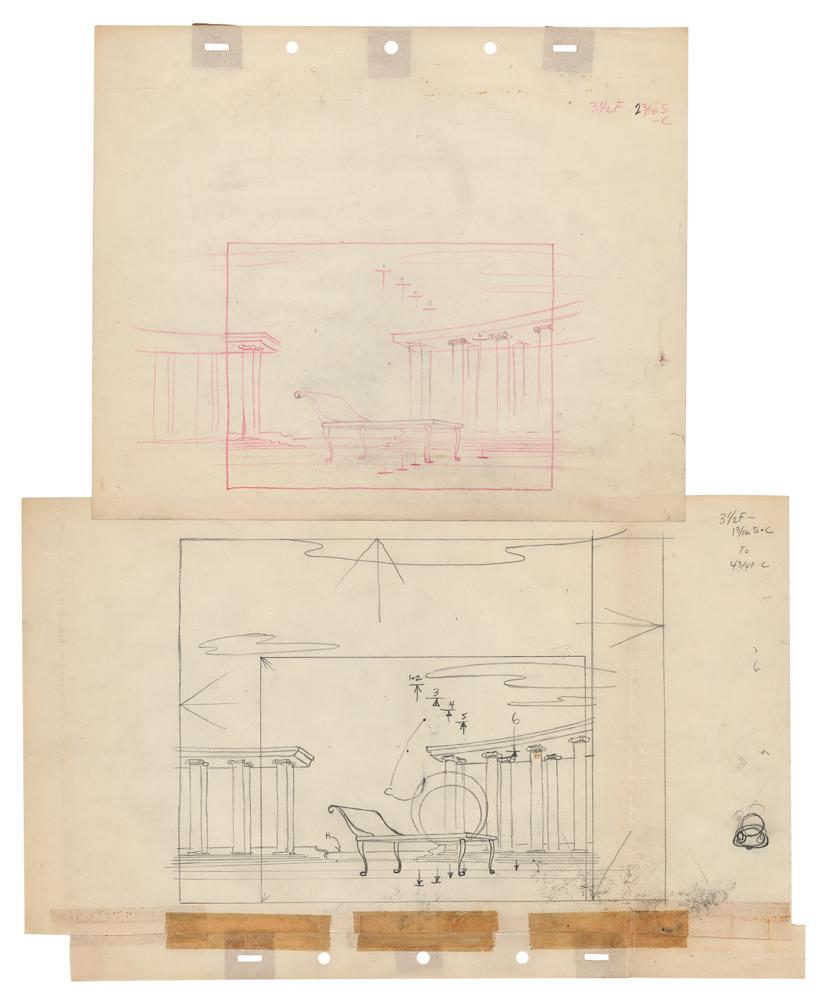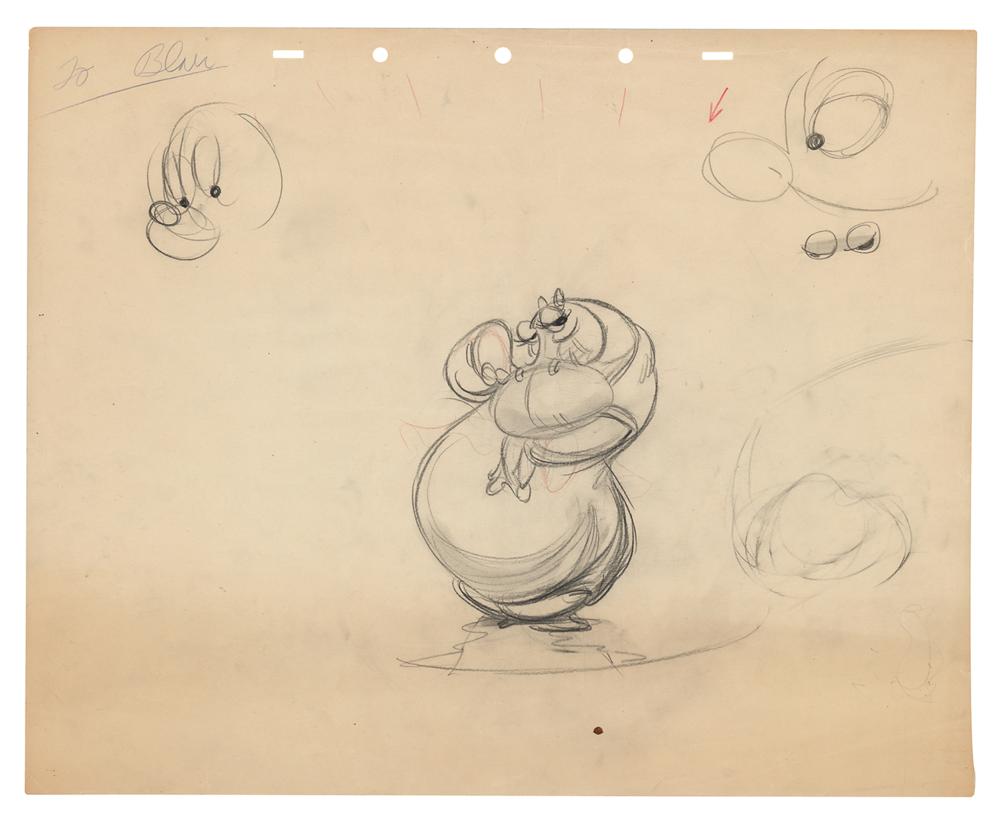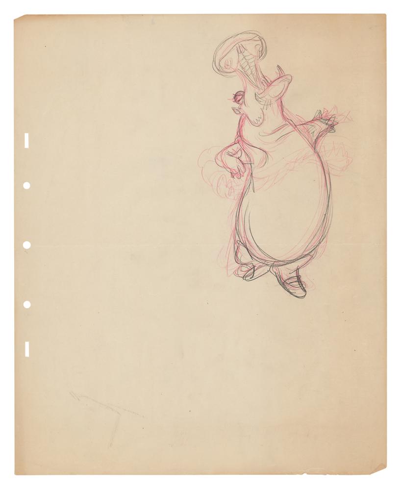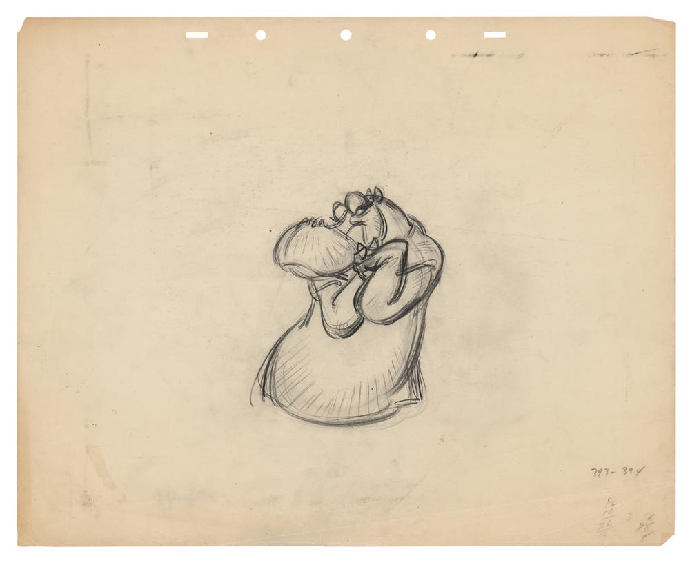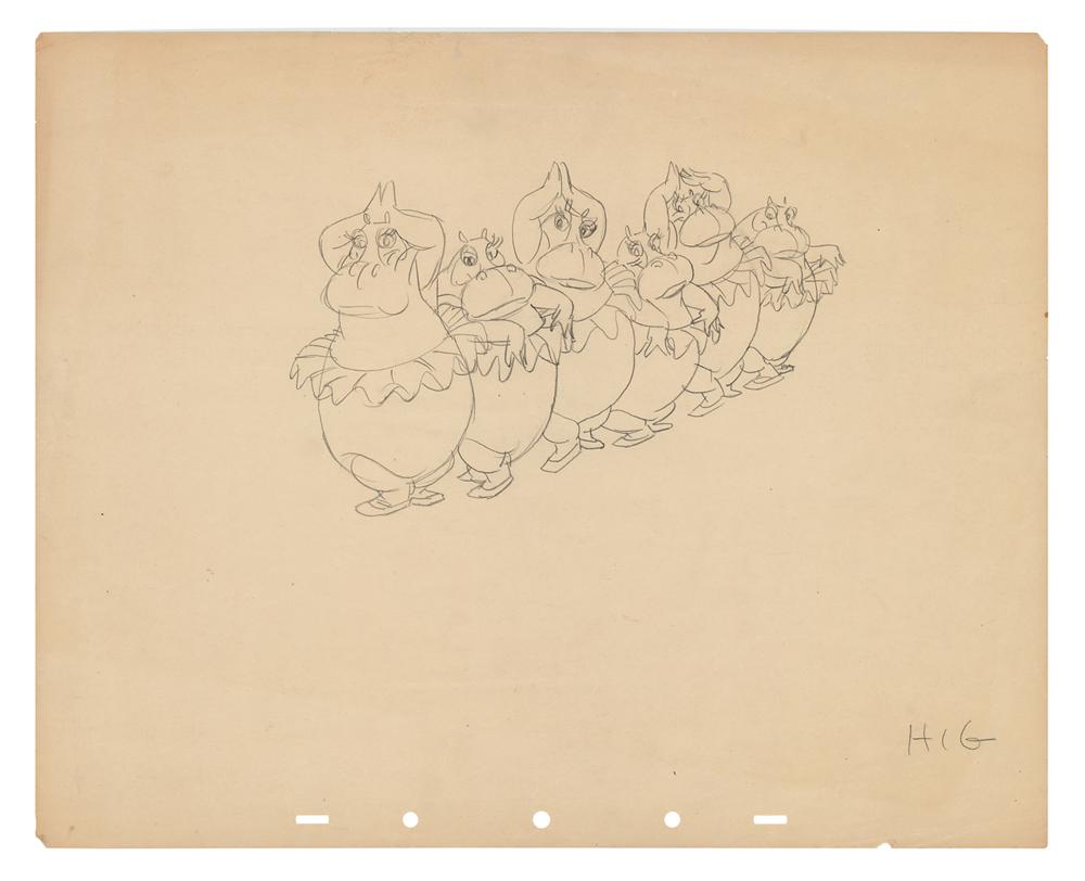 (Walt Disney Studios, 1940) Collection of six original production drawings and two preliminary background drawings from Fantasia by noted character animator Preston Blair, who famously animated the hippo-alligator dance in the ‘Dance of the Hours’ sequence, which is represented with five rough drawings and one storyboard drawing, all of which show Hyacinth Hippo in her tutu; one rough sketch shows Hyacinth posing with a group of five other hippopotami, and the storyboard drawing (marked Unit B) depicts four dancing hippos with blockish noses and hands. These production drawings are all accomplished in graphite and colored pencil on untrimmed 15.5 x 12.5 animation paper, and character images range in size from 4.25 x 5.75 and 10.5 x 10.5. The two original preliminary background drawings depict the interior of the palace from the ‘Dance of the Hours’ sequence and are accomplished in graphite and colored pencil on animation paper measuring 12 x 10 and 15.5 x 9.5. In overall very good to fine condition, with some scattered creasing and small edge tears. Accompanied by a graphite sketch of Hyacinth on a clipped 4.5 x 7 sheet, three semi-glossy storyboard photostats, and a typed letter from Ramsay Harris dated December 20, 1972, which directly mentions the hippo group production drawing from this lot: “And here, before I forget, let me say how much Mary and I have enjoyed the line drawing of the Dance of the Hippos, framed and overlooking our dining table. It has a timeless quality for both of us. Without actually moving your hippos give one a sense of radiant sylphs of ovoid contours forever gliding along with the most delicately graceful tonnage! And each of them is an individual.”