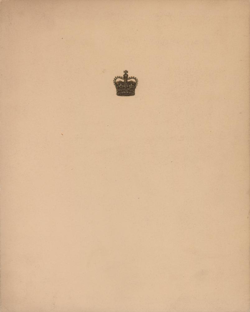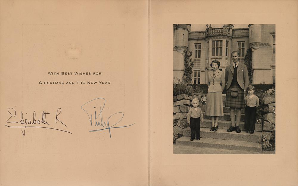 Royal Christmas and New Year's card from 1952, with a gilt-embossed crown on the front, measuring 13.5 x 8.5 open, featuring a charming photo of Queen Elizabeth II and Prince Philip posing with their two young children in front of Balmoral Castle, signed in fountain pen, "Elizabeth R" and "Philip." In fine condition. The consignor notes that the card originates from the collection of British painter Edward Halliday, who for years was commissioned to paint royal portraits for Queen Elizabeth and Prince Philip. Other sitters for Halliday's portraits included Winston Churchill, Edmund Hillary, Lord Denning, and many more. A desirable Christmas card that dates to the first of Queen Elizabeth's seven-decade-long reign.
