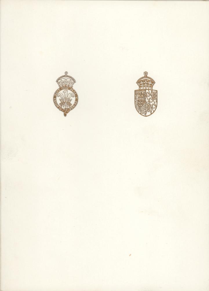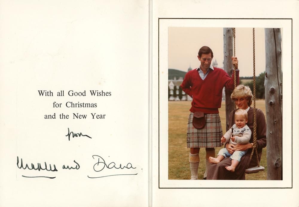 Royal Christmas card from 1983 with embossed in gold on the front with the Prince of Wales’s feathers and Order of the Garter motto and the Spencer family arms, measuring 10.5 x 7.25 open, featuring an affixed color photo of Charles in a kilt and Diana sitting on a swing with toddler Prince William, signed inside in fountain pen, “from Charles and” and “Diana.” In fine condition. Accompanied by the original mailing envelope.
