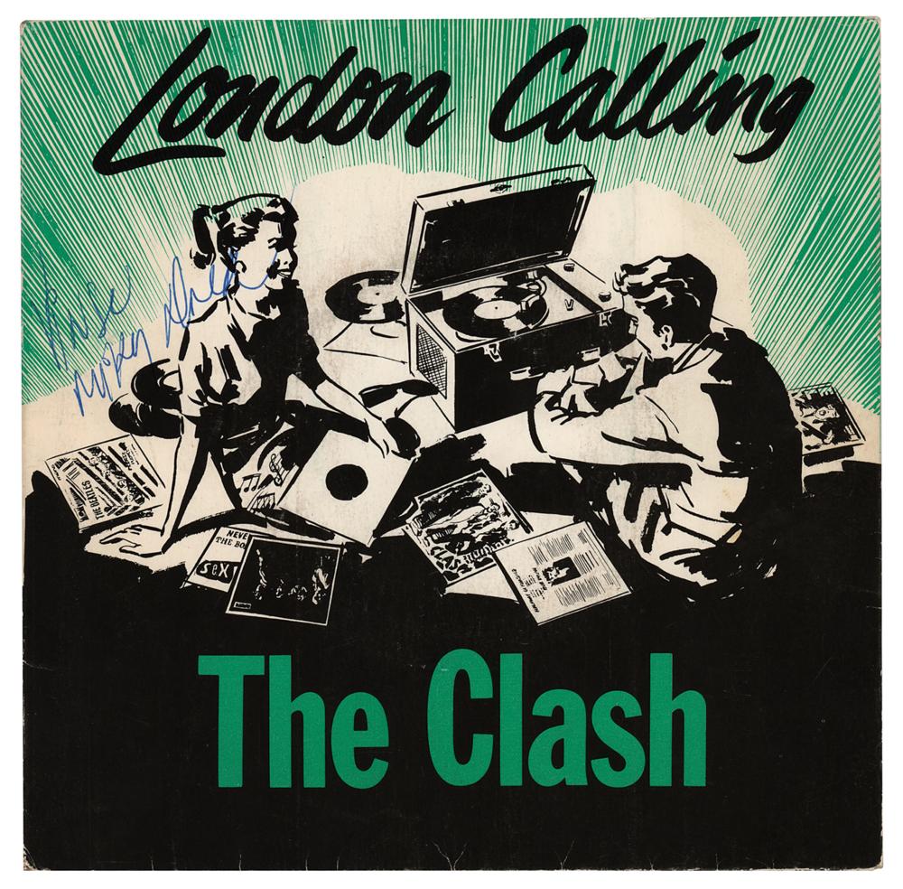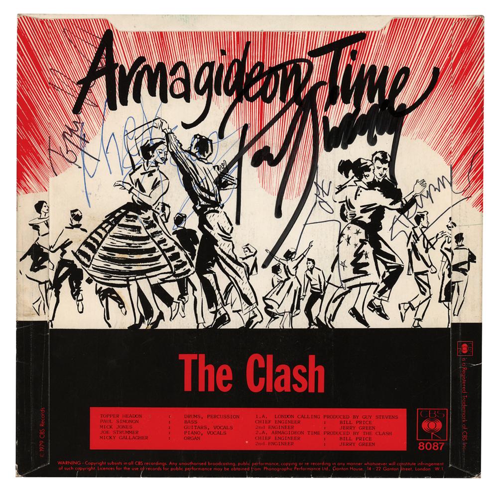 CBS Records 45 RPM single album for ‘London Calling / Armagideon Time’ by The Clash, signed on the back cover in black ink or felt tip by Joe Strummer, Topper Headon, and Paul Simonon, and in blue ballpoint by Mick Jones; the front cover is also signed by reggae pioneer Mikey Dread, who performed on several songs on The Clash’s 1980 album Sandinista! Dread also toured with The Clash across Britain, Europe, and the U.S. In fine condition, with moderate contrast to the Clash signatures. The record is not included.