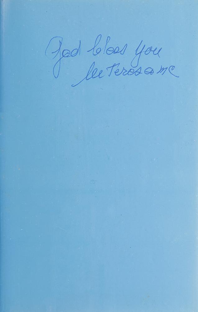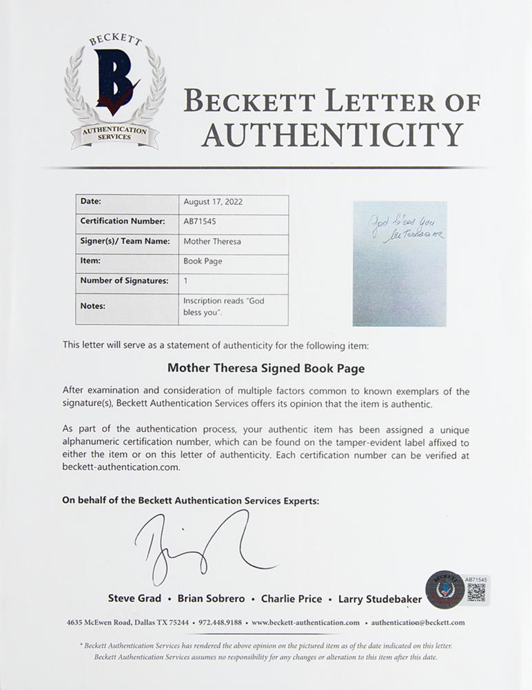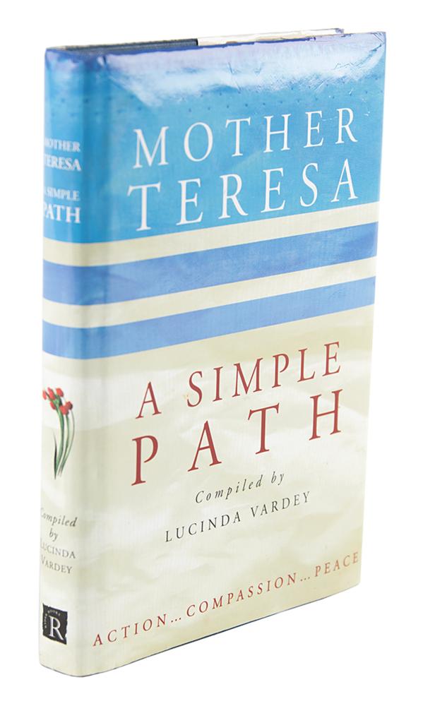 Signed book: Mother Teresa: A Simple Path. London: Rider, 1995. Hardcover with dust jacket, 5.25 x 7.75, 192 pages. Signed on the first free end in blue ballpoint, "God bless you, M Teresa mc." In fine condition, with a gift inscription on the half-title page. Accompanied by a full letter of authenticity from Beckett Authentication Services.