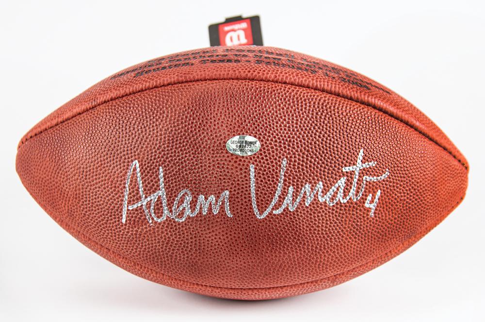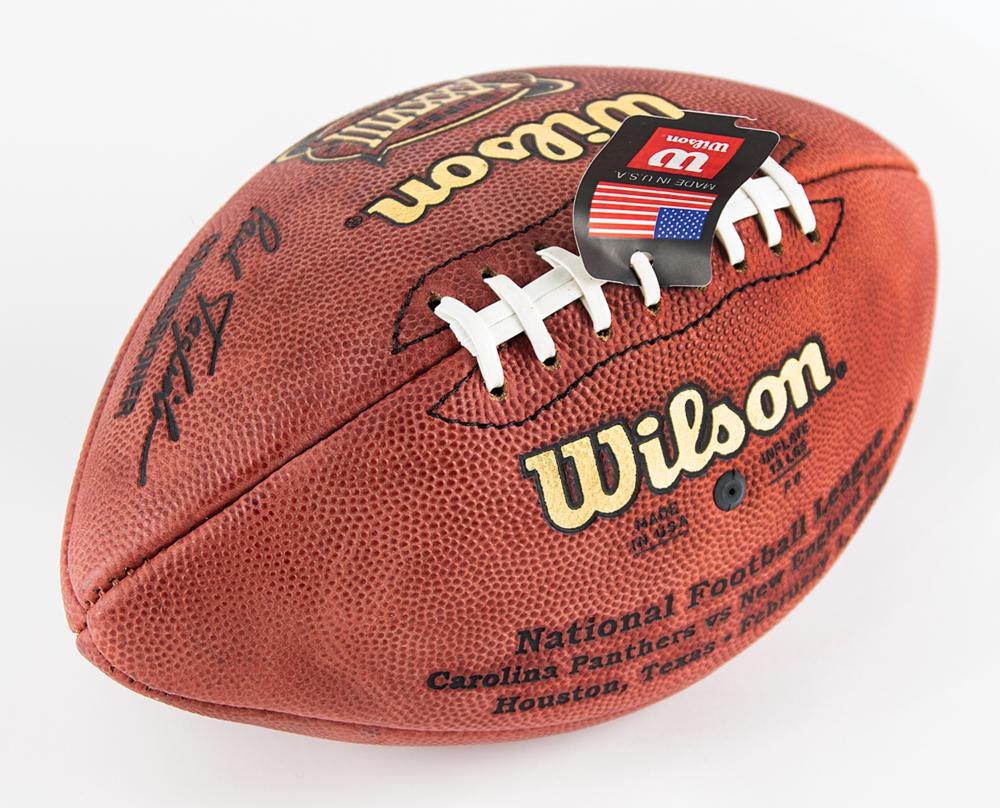 Official Wilson Super Bowl XXXVIII football commemorating the championship game in Houston between the Carolina Panthers and New England Patriots, signed in silver ink on a side panel, "Adam Vinatieri, 4." In fine condition. Accompanied by a ticket to a private signing with Vinatieri in 2004. The memorable Super Bowl contest was decided when Patriots kicker Adam Vinatieri made a 41-yard field goal with four seconds left, breaking a tie to win 32-29.