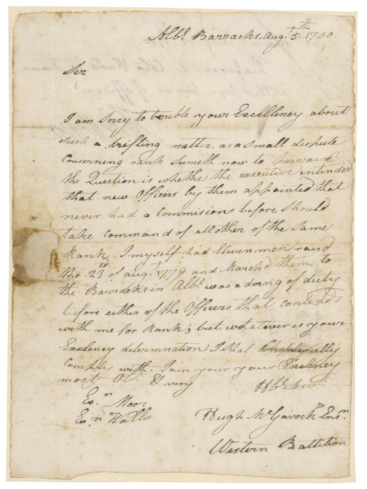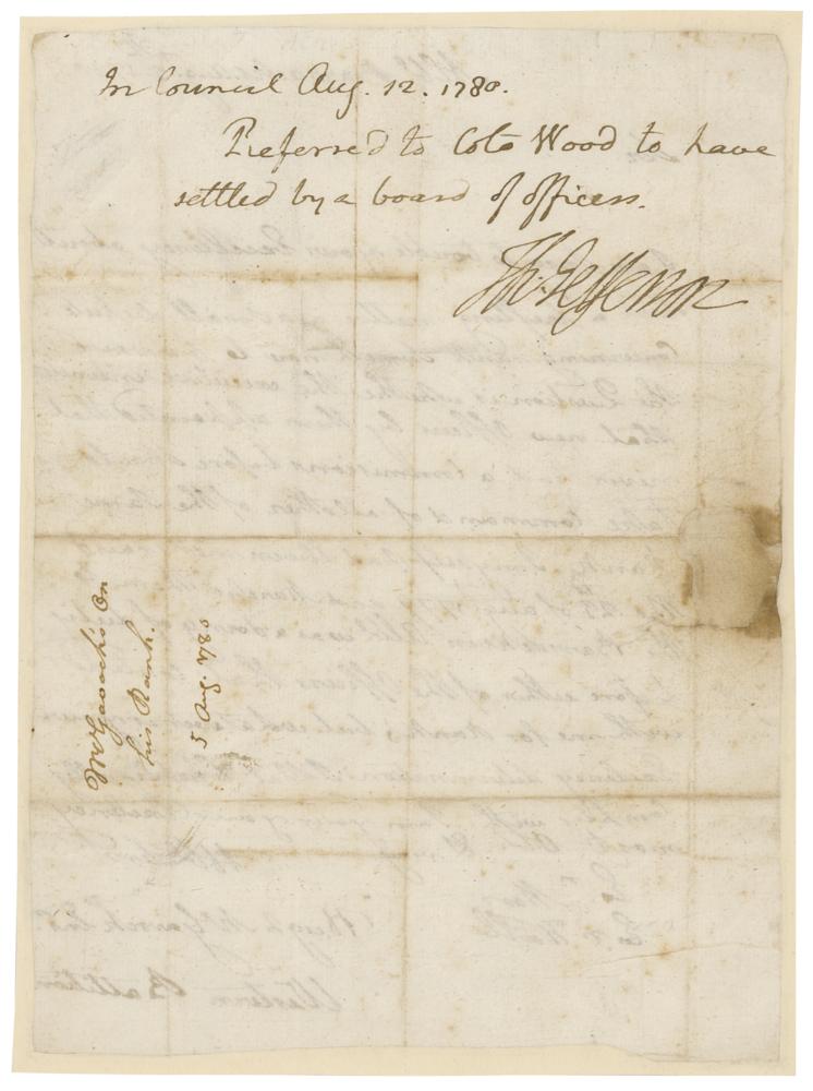 Revolutionary War-dated autograph endorsement signed, "In Council, Aug. 12, 1780. Referred to Col. Wood to have settled by a board of officers. Th: Jefferson," handwritten on the reverse of an ALS written by Hugh McGavock from the Albemarle Barracks, August 5, 1780, regarding several other officers contending with him for rank, "that new officers…appointed that never had a commission before should take command of all others of the same rank." Professionally inlaid to a slightly larger sheet and in very good to fine condition, with an area of repaired seal-related paper loss.