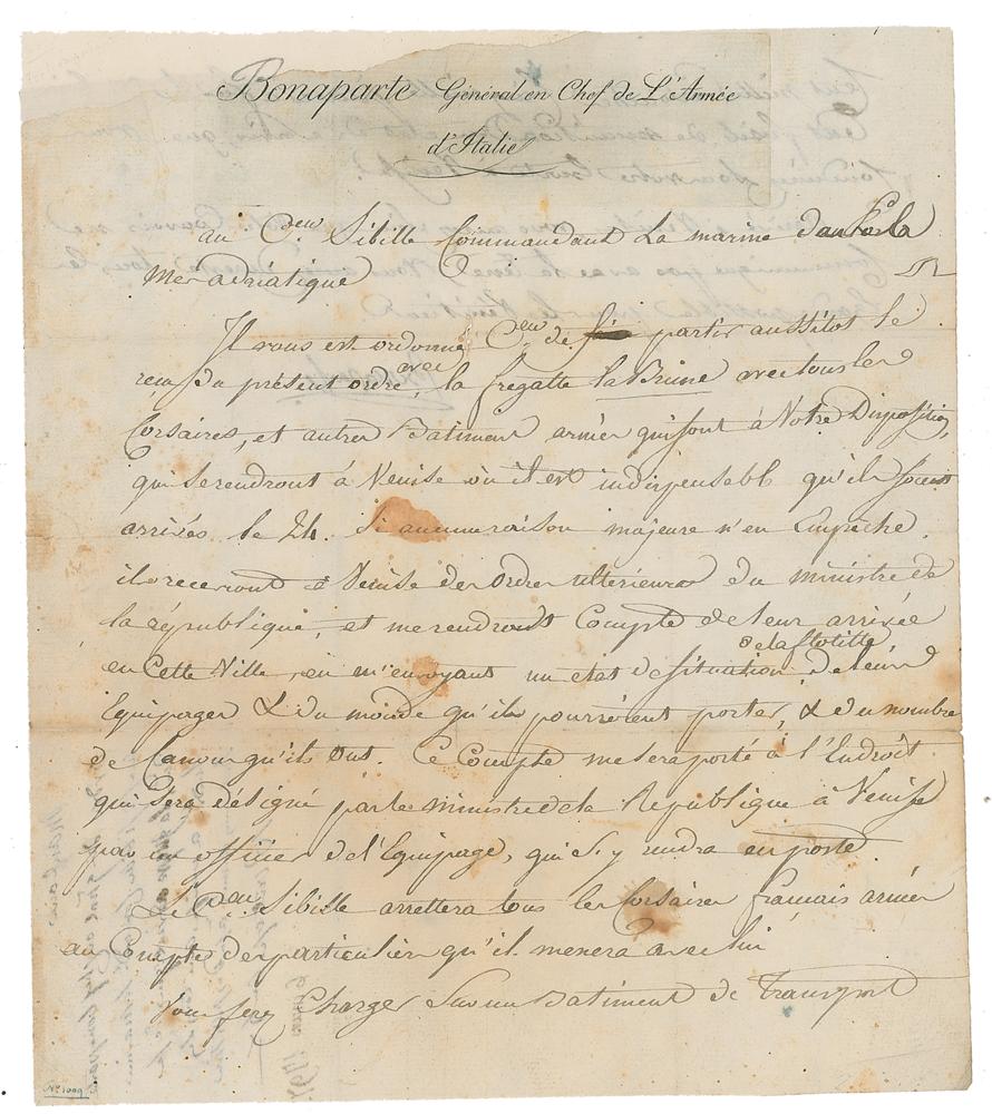 LS in French, signed “Bonaparte,” one page both sides, 9 x 10.5, General en Chef de L'Armee d'Italie letterhead, March 6, 1797. Untranslated military order to "Sibille, Commandant La Marine." In very good to fine condition, with scattered small stains, and reconstruction (with a few small text embellishments) to the top edge.