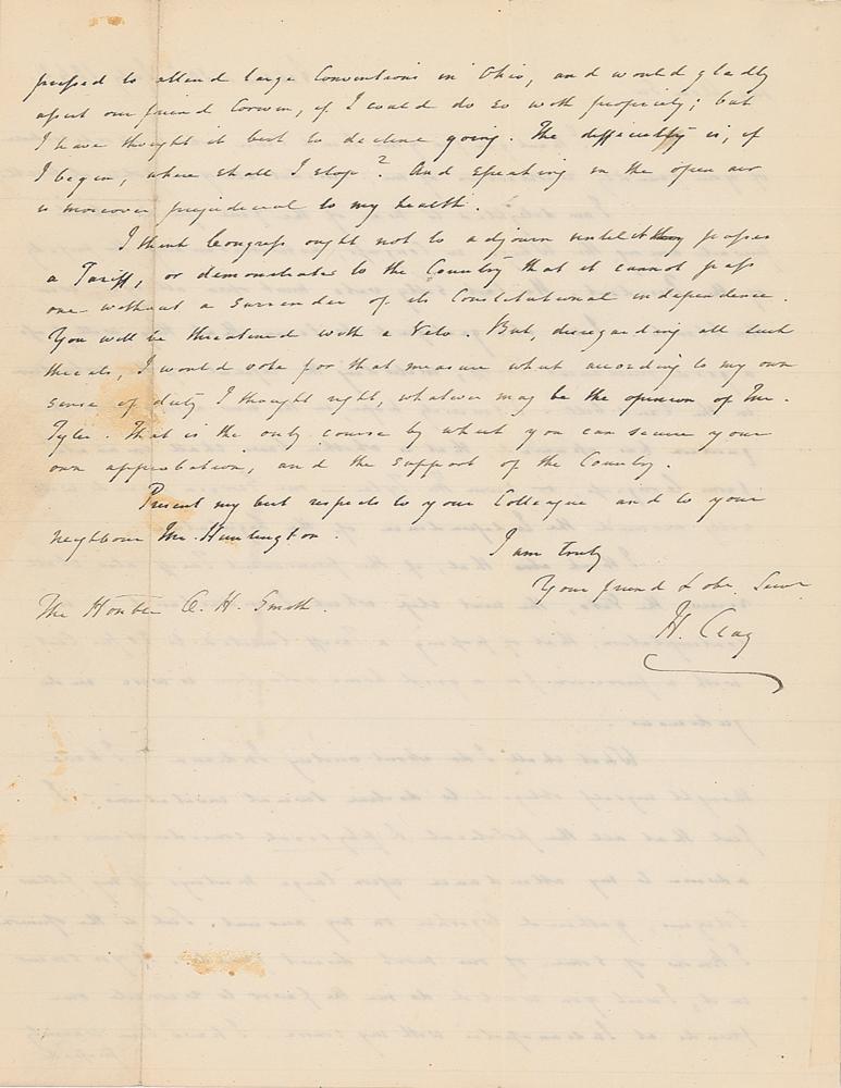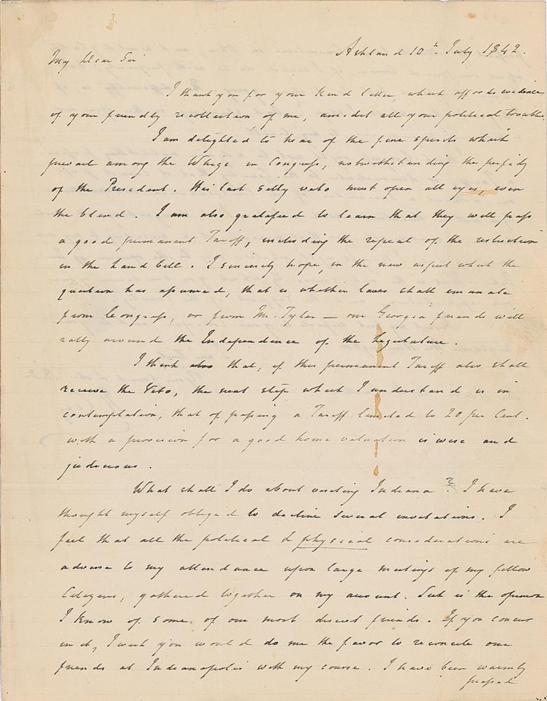ALS signed “H. Clay,” one page both sides, 8 x 10, July 10, 1842. Handwritten letter to Indiana Senator Oliver H. Smith, in part: "I am delighted to hear of the fine speeches which prevail among the Whigs in Congress, notwithstanding the perfidy of the President. His last silly veto must open all eyes, even the blind. I am also gratified to learn that they will pass a good permanent Tariff, including the repeal of the resolution in the Land bill. I sincerely hope?whether laws shall emanate from Congress, or from Mr. Tyler—our Georgia friends will rally around the Independence of the Legislature?I think Congress ought not to adjourn until it passes a Tariff, or demonstrates to the Country that it cannot pass one without a surrender of its Constitutional independence. You will be threatened with a veto. But, disregarding all such threats, I would vote for that measure which according to my own sense of duty I thought right, whatever may be the opinion of Mr. Tyler." Addressed on the integral leaf in Clay's hand. In fine condition, with scattered small stains, and seal-related paper loss to the integral address leaf.