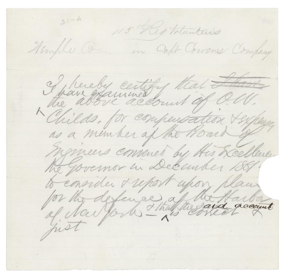 Civil War-era handwritten draft of a document in pencil by Arthur, unsigned, one page, 7.75 x 7.5, no date. Document pertaining to the 115th Reg. Volunteers (the “Iron Hearted Regiment”) in Captain Cowen’s Company. Arthur writes: "I hereby certify that I have examined the above account of O. W. Childs, for compensation & expenses, as a member of the Board of Engineers convened by His Excellency the Governor in December 1861 to consider & report upon plans for the defence of the Harbor of New York—and that the said account is correct and just" In very good to fine condition, with splitting to the ends of the folds, and a semicircular area of paper loss to the right edge, affecting a couple of words.