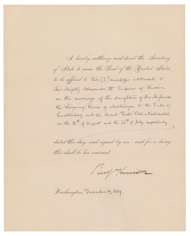 Partly-printed DS as president, signed “Benj. Harrison,” one page, 8 x 10, December 10, 1889. President Harrison directs the "Secretary of State to cause the Seal of the United States to be affixed to two (2) envelopes addressed to His Majesty Alexander III Emperor of Russia, on the marriage of the daughters of His Highness the Reigning Prince of Montenegro to the Duke of Leuchtenberg and the Grand Duke Peter Nicolaiewitch on the 16th of August and the 26th of July respectively." In fine condition. On July 26, 1889, Grand Duke Peter Nikolaevich of Russia married Princess Milica of Montenegro. On August 16th, George Maximilianovich, 6th Duke of Leuchtenberg married Grand Duchess Maria Nikolaevna of Russia. A significant diplomatic document from the Harrison administration.