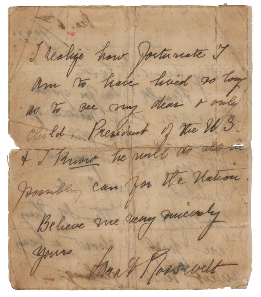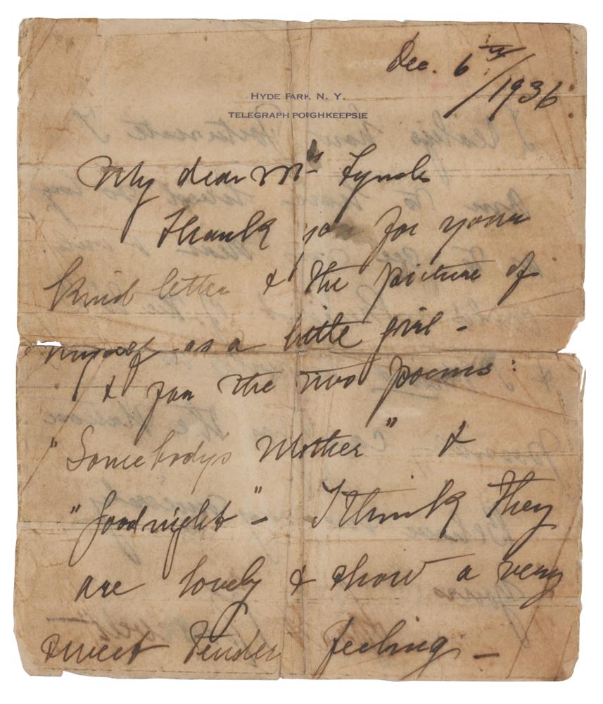 Mother (1854-1941) of Franklin D. Roosevelt. ALS signed “Sara D. Roosevelt,” one page both sides, 5.75 x 6.75, Hyde Park letterhead, December 6, 1936. Handwritten letter to Margaret Irene Lynch, in full: "Thank you for your kind letter & the picture of myself as a little girl—& for the two poems: 'Somebody's Mother' & 'Goodnight.' I think they are lovely & show a very sweet tender feeling. I realize how fortunate I am to have lived so long as to see my dear & only child, President of the U.S. & I know he will do all he possibly can for the Nation." In good to very good condition, with heavy overall creasing and staining. Accompanied by the original hand-addressed mailing envelope.