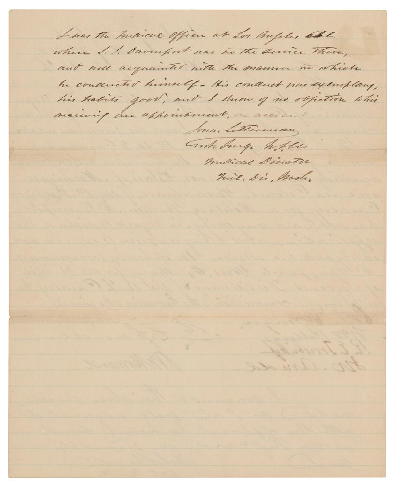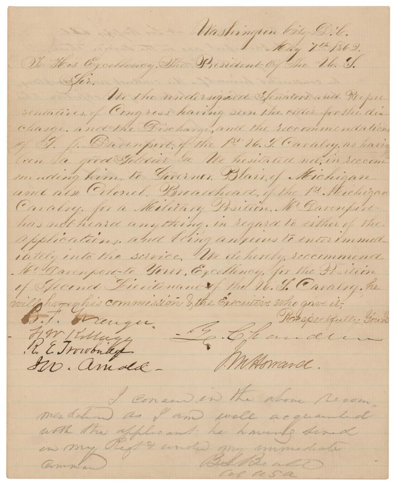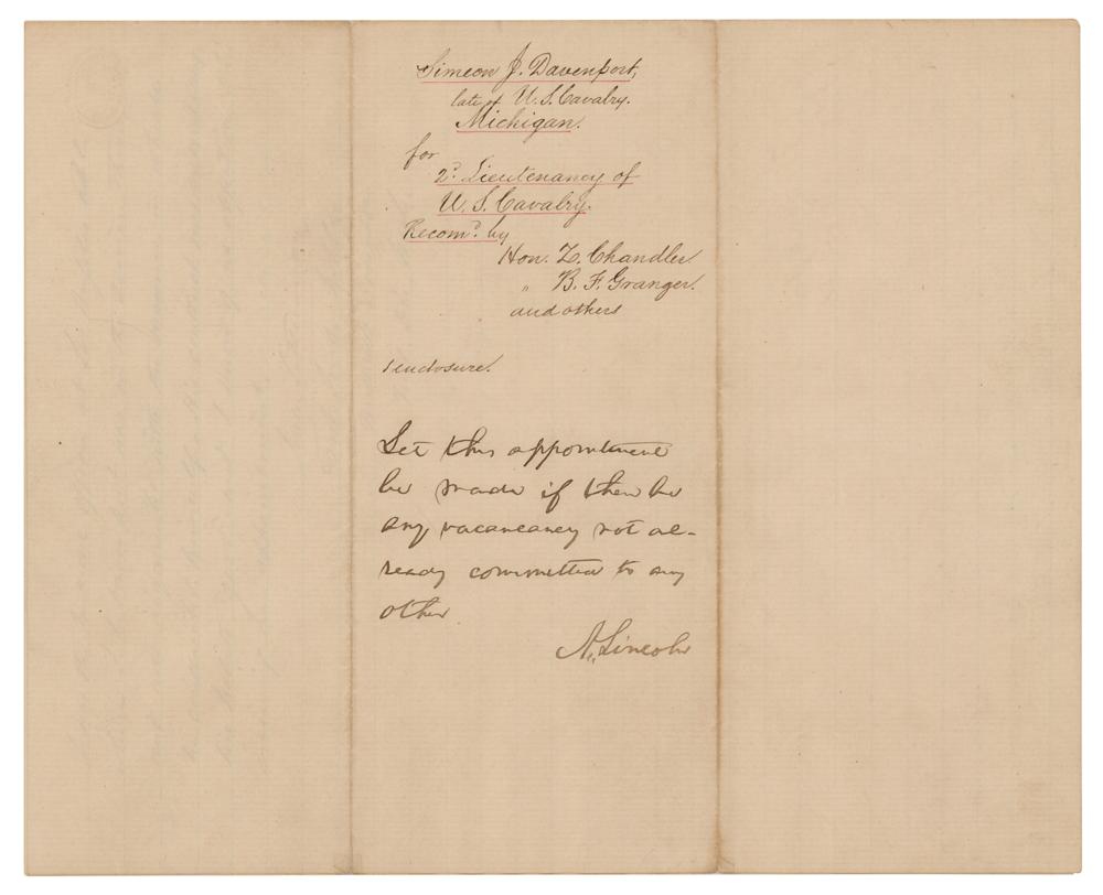 Superlative Civil War-dated autograph endorsement as president, signed "A. Lincoln," penned on the reverse of a letter written to him by members of the 38th Congress, one page, 7.75 x 9.75, May 7, 1862. The letter, recommending Simeon J. Davenport "for the Position of Second Lieutenant of the U.S. Cavalry," is endorsed by Senators Zachariah Chandler and Jacob M. Howard, and Congressmen Bradley F. Granger, Francis W. Kellogg, Rowland E. Trowbridge, and Isaac N. Arnold; it boasts further handwritten endorsements by Colonel Benjamin Lloyd Beall and Assistant Surgeon Jonathan Letterman. On the reverse, President Lincoln writes: "Let this appointment be made if there be any vacancy not already committed to any other." In fine condition, with professional fold reinforcements.