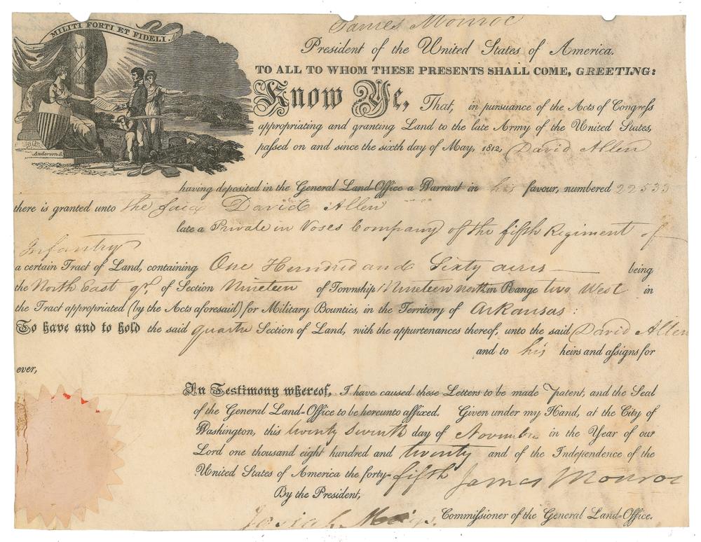 Partly-printed vellum DS as president, one page, 11 x 8.25, November 27, 1820. President Monroe grants "David Allen, late a Private in Voses Company of the fifth Regiment of Infantry, a certain Tract of Land, containing One Hundred and Sixty acres?in the Territory of Arkansas." Boldly signed at the conclusion by President Monroe, and countersigned by Commissioner of the General Land Office Josiah Meigs. The white paper seal affixed to the lower left corner is partially intact, with the left edge trimmed. In very good to fine condition, with significantly trimmed edges (affecting part of Meigs's signature), light soiling, and three binder dings to the top edge.