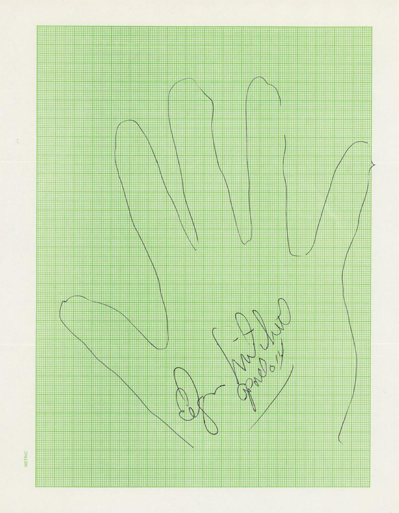 Original traced outline of Edgar Mitchell’s hand, accomplished by the moonwalker in black ballpoint on an 8.5 x 11 sheet of graph paper, signed at the bottom, “Edgar Mitchell, Apollo 14.” In fine condition, with mailing folds.